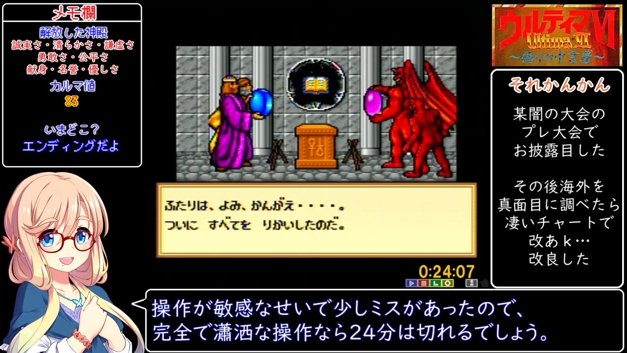 一応Speedrun.comの世界記録を14秒ほど更新したらしいので初投稿です。<br>※追記:Speedrun.comに申請したら通りました<br>※追記2:10/25時点で抜かれて世界2位に転落したわガハハ<br><br>基本的に淡々と解説するだけである!!<br>※途中でそらさんの設定をうっかり変更してしまって前半と後半でやや声が違います。ご了承くだせえ<br>保存用youtube無編集:<a href="https://www.youtube.com/watch?v=ehK_XmYT2Ro" target="_blank" rel="noopener nofollow">https://www.youtube.com/watch?v=ehK_XmYT2Ro</a><br>ニコニコ無編集:<a href="https://www.nicovideo.jp/watch/sm41228105" class="watch">sm41228105</a><br><br>プレイ環境:実機+アスキーパッド<br>キャプチャ:2000円のキャプボ+RetroScaler2X<br>タイマースタート:メッセージ速度を決定した瞬間<br>タイマーストップ:コデックスにボルテックスキューブを使用した瞬間<br>(Speedrun.com基準)<br><br>つかったそざい:<br>そらさん→<br><a href="https://seiga.nicovideo.jp/seiga/im8355446" target="_blank" rel="noopener">im8355446</a><br><br>たくさんの広告ありがとうございます<br>みんなもやろう、ウルティマ6!<br />----------共通エリア-----------<br>ゲーム用マイリスト:<a href="https://www.nicovideo.jp/mylist/65763430" target="_blank" rel="noopener">mylist/65763430</a>