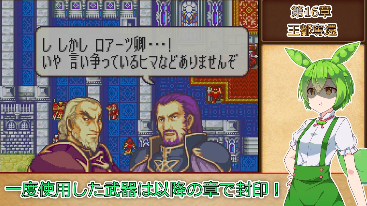 <span style="color: #85200c; font-size: 24px;"><strong><i>封印リストの形式を変更してみました。<br>どうかな?</i></strong></span><br><br><strong>ルール1:一度使用した武器は、以降の章で使用する事を禁止する。<br>ルール2:武器の使用の定義は『その武器を装備した状態で敵との戦闘が発生したタイミング』『その武器を売却して換金した場合』杖の場合は『対象に対して使用した時点(命中の可否は問わない)』とする。<br>ルール3:難易度はハードとする。<br>ルール4:1章から終章まで全ての章を攻略し、仲間に出来るユニットは全員加入させ、生存させる。</strong><br><span style="color: #ff0000;"><strong>※ただしルート分岐次第で行けない章、加入出来ない仲間は除外。</strong></span><br><br>本動画のシリーズリスト【<a href="https://www.nicovideo.jp/series/316824" target="_blank" rel="noopener">series/316824</a>】<br>part1【<a href="https://www.nicovideo.jp/watch/sm40376370" class="watch">sm40376370</a>】<br>前:【<a href="https://www.nicovideo.jp/watch/sm41195068" class="watch">sm41195068</a>】次:【<a href="https://www.nicovideo.jp/watch/sm41252307" class="watch">sm41252307</a>】<br><br><strong>使用したソフト</strong><br>VOICEROID+東北きりたんEX<br>VOICEROID+東北ずん子EX<br>VOICEROID2 東北イタコ<br>VOICEVOX:ずんだもん<br><strong>お借りした立ち絵</strong><br>【<a href="https://seiga.nicovideo.jp/seiga/im10626877" target="_blank" rel="noopener">im10626877</a>】【<a href="https://seiga.nicovideo.jp/seiga/im10910197" target="_blank" rel="noopener">im10910197</a>】【<a href="https://seiga.nicovideo.jp/seiga/im10886085" target="_blank" rel="noopener">im10886085</a>】【<a href="https://seiga.nicovideo.jp/seiga/im10572401" target="_blank" rel="noopener">im10572401</a>】<br><strong>お借りした素材</strong><br>ニコニコモンズの皆様(コンテンツツリー参照)<br />VOICEVOXホームページ:<a href="https://voicevox.hiroshiba.jp/" target="_blank" rel="noopener nofollow">https://voicevox.hiroshiba.jp/</a><br>編集ソフト :YMM4<br>投稿動画part1まとめマイリスト:<a href="https://www.nicovideo.jp/mylist/72070653" target="_blank" rel="noopener">mylist/72070653</a><br>あまり喋らないツイッター:<a href="https://twitter.com/titeinotami" target="_blank" rel="noopener nofollow">https://twitter.com/titeinotami</a>