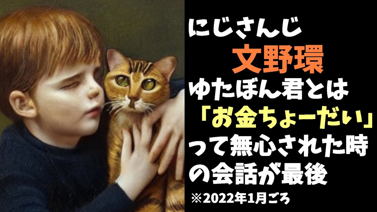 2022年10月9日に、にじさんじ所属のVTuberの野良猫こと文野環さんより衝撃の発言が飛び出しました。炎上芸を始める前に何度かコラボしていたゆたぼん君との最後の会話は2022年1月ごろのクラウドファンディングの時の金の無心を断った時のものだったとのこと・・・。<br><br>引用 <br>ちびまる子ちゃん見終わったら配信開始【雑談】兄弟の話、ものをなくした話、靴に穴が空いた話【にじさんじ】<br><a href="https://youtu.be/q0DQW06EsOc?t=3481" target="_blank" rel="noopener nofollow">https://youtu.be/q0DQW06EsOc?t=3481</a><br><br>Youtube <a href="https://www.youtube.com/channel/UCzYQPx8MeE99DUkW9Y_txJw" target="_blank" rel="noopener nofollow">https://www.youtube.com/channel/UCzYQPx8MeE99DUkW9Y_txJw</a><br>twitter <a href="https://twitter.com/V_Virgin_Mary" target="_blank" rel="noopener nofollow">https://twitter.com/V_Virgin_Mary</a><br><br>使用素材<br>高品質なフリー動画素材 - Pixabay <a href="https://pixabay.com/ja/videos" target="_blank" rel="noopener nofollow">https://pixabay.com/ja/videos</a>