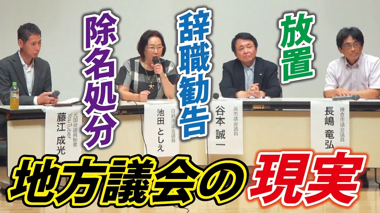 ❑署名募集中 【2022年10月22日締め切り】<br>詳細はこちらをご確認ください<br><a href="https://docs.google.com/forms/d/e/1FAIpQLSedlVZlv2o-wdRZnlueNqDOp0zQWohGNKwqjv7yFF4xYn1qgA/viewform" target="_blank" rel="noopener nofollow">https://docs.google.com/forms/d/e/1FAIpQLSedlVZlv2o-wdRZnlueNqDOp0zQWohGNKwqjv7yFF4xYn1qgA/viewform</a><br><br>―――――――――――――――――――――――――――――――<br><br>本動画登場議員<br>・池田としえ 日野市議会議員<br>・谷本誠一 呉市会議員<br>・長嶋竜弘 鎌倉市議会議員<br><br>2022.8.16 東京都町田市で行われたイベントの一部です。<br><br>―――――――――――――――――――――――――――――――<br><br>❑新しい動画サイト「真の日本人増加計画」始めました!<br><a href="https://nicochannel.jp/fujie/" target="_blank" rel="noopener nofollow">https://nicochannel.jp/fujie/</a><br>(ニコニコチャンネル+)<br><br><br>❏藤江の活動を支援していただける方向け<br>【藤江支援口座】のご案内<br>住信SBIネット銀行 ミカン支店(店番号103)<br>口座番号 3107694<br>口座名義 フジエ マサミツ<br><br>――――――――――――――――――――――――――――――<br><br>日本の人口増加を目指す男、藤江です!【メインチャンネル】<br><a href="https://www.youtube.com/c/JINKOUZOUKA/" target="_blank" rel="noopener nofollow">https://www.youtube.com/c/JINKOUZOUKA/</a><br><br>地域と日本の存続のためニ!【藤江2ndチャンネル】<br><a href="https://www.youtube.com/channel/UCfBh4rv5UT7D-qR6KsoZrsA" target="_blank" rel="noopener nofollow">https://www.youtube.com/channel/UCfBh4rv5UT7D-qR6KsoZrsA</a><br><br>今こそ!三千年の底力【藤江3rdチャンネル】<br><a href="https://www.youtube.com/channel/UC5Yrsm8-X8nZj4uKgvE7CBw" target="_blank" rel="noopener nofollow">https://www.youtube.com/channel/UC5Yrsm8-X8nZj4uKgvE7CBw</a><br><br>四海兄弟【藤江4thチャンネル】<br><a href="https://www.youtube.com/channel/UCiyJNO57quj80Ysy7nOABvA" target="_blank" rel="noopener nofollow">https://www.youtube.com/channel/UCiyJNO57quj80Ysy7nOABvA</a><br><br>五穀豊穣【藤江5thチャンネル】<br><a href="https://www.youtube.com/channel/UCptMJCoKYghfew5tDzoEqHQ" target="_blank" rel="noopener nofollow">https://www.youtube.com/channel/UCptMJCoKYghfew5tDzoEqHQ</a><br><br>藤江のTwitter<br><a href="https://twitter.com/JINKOUZOUKA_jp" target="_blank" rel="noopener nofollow">https://twitter.com/JINKOUZOUKA_jp</a><br><br>藤江のニコニコ動画<br><a href="https://www.nicovideo.jp/user/5457748" target="_blank" rel="noopener nofollow">https://www.nicovideo.jp/user/5457748</a>