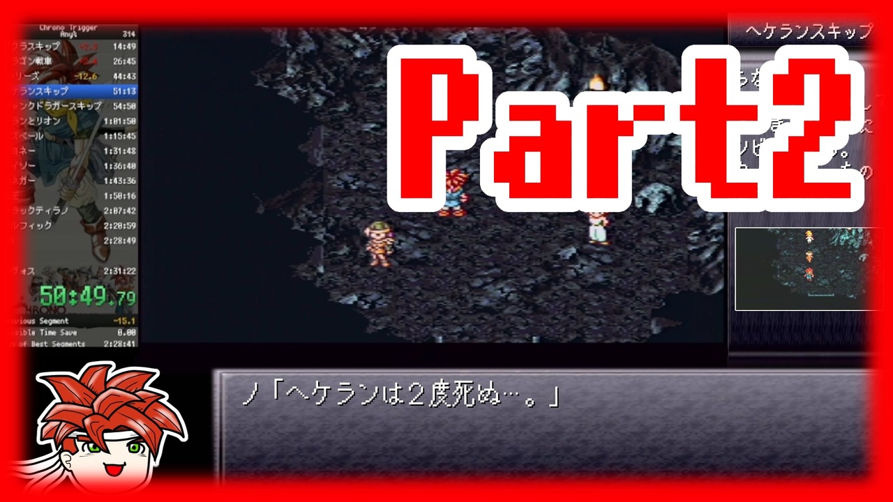 かくれんぼで鬼が勝手に帰ると監禁罪になるらしいので初投稿です。<br>日本1位、世界3位の記録となっています。SRC → <a href="https://www.speedrun.com/ct#Any" target="_blank" rel="noopener nofollow">https://www.speedrun.com/ct#Any</a><br>参考にしたチャート → <a href="http://chrono.wikidot.com/ct-jp" target="_blank" rel="noopener nofollow">http://chrono.wikidot.com/ct-jp</a><br>※英語です<br><br>2022/10/23 パート1に引き続き1万再生越えありがとうございます!<br>またたくさんの広告ありがとうございます!今現在、広告してくれた方を記載しようと思ったら文字数制限で載せられなかったので断念します…。本当にたくさんの広告ありがとうございます!<br>パート3も製作中ですのでもう少しお待ちください!<br><br>2022/10/27 パート3上げました!<br><br>part1 → <a href="https://www.nicovideo.jp/watch/sm41225595" class="watch">sm41225595</a> part3 → <a href="https://www.nicovideo.jp/watch/sm41289331" class="watch">sm41289331</a> マイリス → <a href="https://www.nicovideo.jp/mylist/73882625" target="_blank" rel="noopener">mylist/73882625</a><br>