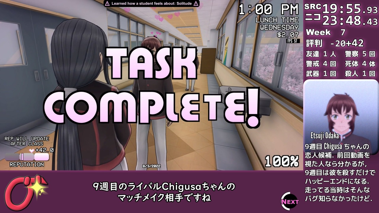 やっぱり感電はみんなの注目集めるのが気持ちいいですね!<br>あと評判工作は地道に進めることになりました.<br><br>前: <a href="https://www.nicovideo.jp/watch/sm41118320" class="watch">sm41118320</a> ←|→ 次: <a href="https://www.nicovideo.jp/watch/sm41440165" class="watch">sm41440165</a>(リスト: <a href="https://www.nicovideo.jp/mylist/73924768" target="_blank" rel="noopener">mylist/73924768</a>)<br><br>本編は <a href="#" class="seekTime" data-seekTime="3:20" onclick="seekNicoPlayer('#3:20'); return false;">#3:20</a> から,オマケは <a href="#" class="seekTime" data-seekTime="15:21" onclick="seekNicoPlayer('#15:21'); return false;">#15:21</a> からどうぞ.<br>ペルソナ相性なんて初めて調べたかも.<br>実はオマケを紹介したくてRTA走ってるのはナイショ.<br><br><strong>・</strong><strong><u>タイマー開始: 空ファイル選択</u></strong><br><strong>・</strong><strong><u>タイマー停止: クレジットの Skip アイコン表示</u></strong><br><strong>・</strong><strong><u>ロード画面中は,SpeedRun→タイマーポーズ,ニコニコ→計測</u></strong><br><strong>・</strong><strong><u>ルール: 80年代モードで S+ランク達成</u></strong><br><strong>・</strong><strong><u>ビルド番号: 8/3/2022,プレイ時点で最新</u></strong><br><br>タイマー付けただけ版: <a href="https://youtu.be/4ES_tB7nVxQ" target="_blank" rel="noopener nofollow">https://youtu.be/4ES_tB7nVxQ</a><br><br>紹介した作品のリスト: <a href="https://twitter.com/i/events/1583366884669685760" target="_blank" rel="noopener nofollow">https://twitter.com/i/events/1583366884669685760</a><br>素敵な作品,ありがとうございました!<br>・味噌人ノ命様: <a href="https://www.nicovideo.jp/user/311938" target="_blank" rel="noopener">user/311938</a><br>・日横様: <a href="https://www.nicovideo.jp/user/22133082" target="_blank" rel="noopener">user/22133082</a><br>・マッキー様: <a href="https://www.nicovideo.jp/user/60533537" target="_blank" rel="noopener">user/60533537</a><br>・紅鴉様: <a href="https://www.nicovideo.jp/user/58280182" target="_blank" rel="noopener">user/58280182</a><br><br>デバイス制限されたラーメンタイマー: <a href="https://www.nicovideo.jp/watch/sm41100114" class="watch">sm41100114</a><br>自作のYanSim風オブジェクト達: <a href="https://1drv.ms/f/s!AjyalerF3xBChV6ffHQ5VyKXKsrh" target="_blank" rel="noopener nofollow">https://1drv.ms/f/s!AjyalerF3xBChV6ffHQ5VyKXKsrh</a><br><br>S+ランクの条件: <a href="https://yanderesimulator.com/s-rank/" target="_blank" rel="noopener nofollow">https://yanderesimulator.com/s-rank/</a><br>ヤンデレシミュレータ本家: <a href="https://www.yanderesimulator.com/" target="_blank" rel="noopener nofollow">https://www.yanderesimulator.com/</a><br>
