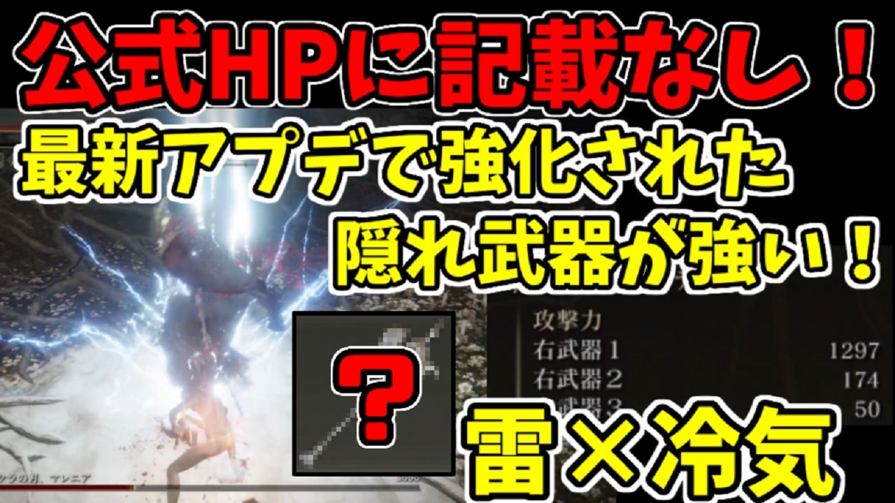 App Ver. 1.07 Regulation Ver. 1.07<br>公式ホームページの最新アプデ情報に記載なし!<br>もともと強かったけど更に強くなりました!<br>雷と冷気ダメージあるので攻略でオススメ!<br>対人だとめちゃくちゃ強いわけではないので良い調整!<br><br>YouTube版⇒<a href="https://www.youtube.com/watch?v=9n2I2JkKlu0" target="_blank" rel="noopener nofollow">https://www.youtube.com/watch?v=9n2I2JkKlu0</a><br>詳しいアプデ内容⇒<a href="https://www.eldenring.jp/newsdetail/n..." target="_blank" rel="noopener nofollow">https://www.eldenring.jp/newsdetail/n...</a><br><br>コナンの黒い人の侵入⇒<a href="https://www.nicovideo.jp/watch/sm40123217" target="_blank" rel="noopener nofollow">https://www.nicovideo.jp/watch/sm40123217</a><br>その他のエルデンリング動画はYouTubeにあげてます<br>YouTube⇒<a href="https://www.youtube.com/channel/UC4BkylcNgiMoFvpYPpcZEEw" target="_blank" rel="noopener nofollow">https://www.youtube.com/channel/UC4BkylcNgiMoFvpYPpcZEEw</a><br>Twitter⇒<a href="https://twitter.com/0141ktkr" target="_blank" rel="noopener nofollow">https://twitter.com/0141ktkr</a>