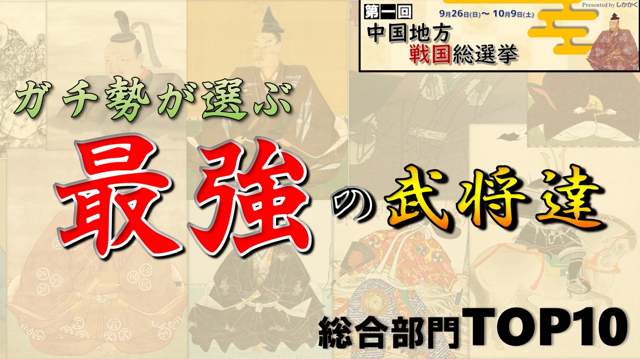 初めまして、しかかくと申します。<br>今回は2021年10月に当チャンネルで行った「第一回中国地方戦国総選挙」の総合部門Top10の結果発表です!<br>各武将の余り知られていない小ネタも解説しておりますので投票に参加された方もされていない方も是非ご覧ください。<br><br>#中国地方戦国総選挙<br><br>参考文献<br>「播磨国宍粟郡広瀬宇野氏の史料と研究」<br>「岡山県中世城館跡総合調査報告書」<br>光成準治 『小早川隆景・秀秋ー消え候わんとて、光増すと申すー』<br>藤井崇 『大内義興 西国の「覇者」の誕生』<br>藤井崇 『大内義隆ー類葉武徳の家を称し、大名の器に載る』<br>岸田裕之 『毛利元就ー武威天下無双、下民憐愍の文徳は未だ』<br>大西泰正編『備前宇喜多氏』<br>中野等 『黒田孝高』<br>佐伯徳哉 『出雲の中世 地域と国家のはざま』<br>鳥取県編 『尼子氏と戦国時代の鳥取』<br>鳥取県編 『織田vs毛利 鳥取をめぐる攻防』<br>森俊弘 「宇喜多直家の備前統一と岡山平野」<br>畑和良 「宇喜多秀家と「鷹」」<br>川岡勉 「尼子氏による出雲国成敗権掌握」<br><br>使用楽曲<br>童歌~宴~:とんち様(<a href="https://commons.nicovideo.jp/works/nc187207" target="_blank" rel="noopener">nc187207</a>)<br>聖徳探偵の華麗なる事件簿:白鷺ゆっきー様(「音降る神霊廟」より)<br>恋色マスタースパークremix:平茸様(<a href="https://www.nicovideo.jp/watch/sm4663337" class="watch">sm4663337</a>)<br>東方妖々夢~ Ancient Temple:漉餡様(<a href="https://www.nicovideo.jp/watch/sm23893686" class="watch">sm23893686</a>)<br>永遠の三日天下:goloa様(<a href="https://commons.nicovideo.jp/works/nc157874" target="_blank" rel="noopener">nc157874</a>)<br>ネイティブフェイス:ちもち王国様(<a href="https://commons.nicovideo.jp/works/nc90641" target="_blank" rel="noopener">nc90641</a>)<br>Fickle travelogue:まりつみ様(<a href="https://www.nicovideo.jp/watch/sm37195543" class="watch">sm37195543</a>)<br>黒い海に赤いお魚:死境三千歳様(<a href="https://commons.nicovideo.jp/works/nc231462" target="_blank" rel="noopener">nc231462</a>)<br>小さな小さな賢将:goloa様(<a href="https://commons.nicovideo.jp/works/nc156159" target="_blank" rel="noopener">nc156159</a>)<br>雨舞(Jazzアレンジ):漉餡様(<a href="https://www.nicovideo.jp/watch/sm24346162" class="watch">sm24346162</a>) <br>oʇɐɔıɟıʇuəpı uou:シイナフユキ様(<a href="https://www.nicovideo.jp/watch/sm20979623" class="watch">sm20979623</a>)<br>再臨の儀:白鷺ゆっきー様(「音降る神霊廟」より)<br>大和に散らばる不思議な森:白鷺ゆっきー様(「やまとごはん」より)<br><br>・使用立ち絵<br>豊聡耳神子・物部布都・蘇我屠自古<br>(原作:東方project、 絵:真田源次郎ベル助 様)<br><a href="https://twitter.com/berusuke_sanada" target="_blank" rel="noopener nofollow">https://twitter.com/berusuke_sanada</a><br><br>Youtube; <a href="https://www.youtube.com/channel/UCRyZjTeQgxd8iXcL2P8vwNA" target="_blank" rel="noopener nofollow">https://www.youtube.com/channel/UCRyZjTeQgxd8iXcL2P8vwNA</a><br>Twitter; <a href="https://twitter.com/SquareDeerHorn" target="_blank" rel="noopener nofollow">https://twitter.com/SquareDeerHorn</a>