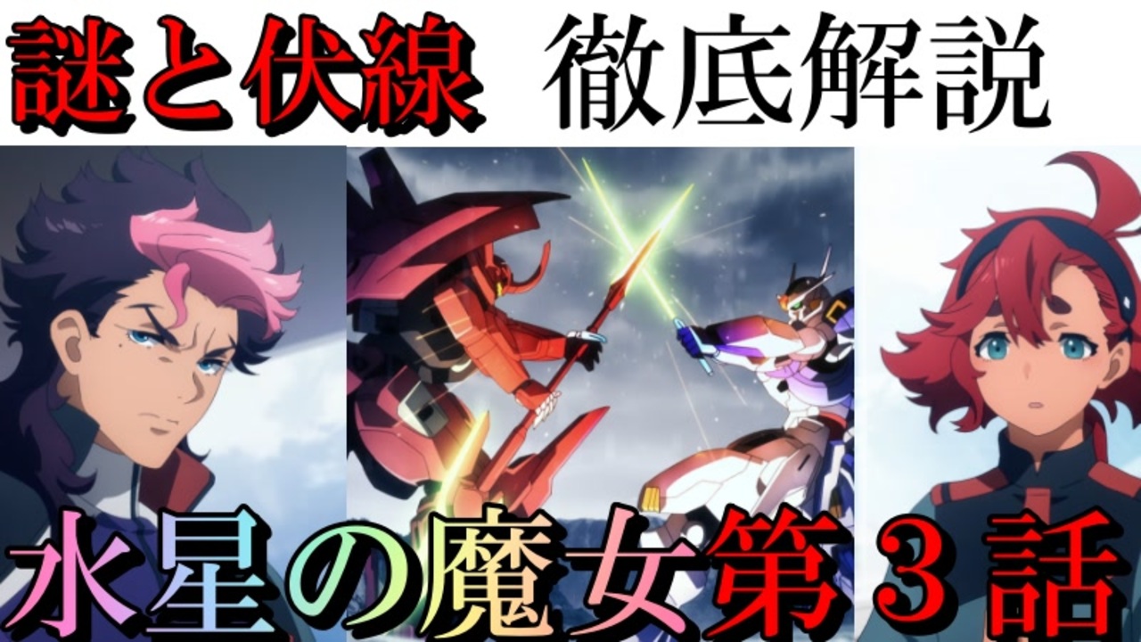 【水星の魔女】第3話、徹底解説VOICEROID版:グエル君は何故スレッタに求婚したのか、ダブスタおじさんの大義やグエル君の今後の道筋などを解説、考察【機動戦士ガンダム】<br><br>機動戦士ガンダム、水星の魔女、第3話を、予想と妄想を交えながら解説、考察する動画です。<br><br>今回はほぼ考察です。<br><br>以前投稿した3話感想、考察のずんだもんバージョンです。<br>※生声のおじさんは主力コンペで負けたのでプロジェクト凍結です<br><br>『機動戦士ガンダム 水星の魔女』 前日譚「PROLOGUE」冒頭5分<br><a href="https://www.youtube.com/watch?v=flgHot9HJsc" target="_blank" rel="noopener nofollow">https://www.youtube.com/watch?v=flgHot9HJsc</a><br><br>水星の魔女、小説版<br>「ゆりかごの星」<br><a href="https://g-witch.net/music/novel/" target="_blank" rel="noopener nofollow">https://g-witch.net/music/novel/</a><br><br><br>『機動戦士ガンダム 水星の魔女』 前日譚「PROLOGUE」冒頭5分<br><a href="https://www.youtube.com/watch?v=flgHot9HJsc" target="_blank" rel="noopener nofollow">https://www.youtube.com/watch?v=flgHot9HJsc</a><br><br>水星の魔女、小説版<br>「ゆりかごの星」<br><a href="https://g-witch.net/music/novel/" target="_blank" rel="noopener nofollow">https://g-witch.net/music/novel/</a><br><br><br>質問、などありましたらこちらにも<br><a href="https://twitter.com/@i4S0LHspdgzBTor" target="_blank" rel="noopener nofollow">https://twitter.com/@i4S0LHspdgzBTor</a><br><br>清見元康名義でたいあっぷ、小説家になろう、カクヨムなどに投稿しています。<br>もし良ければ応援お願いしますm(_ _)m<br><a href="https://tieupnovels.com/user/GariGari" target="_blank" rel="noopener nofollow">https://tieupnovels.com/user/GariGari</a><br><a href="https://mypage.syosetu.com/953815/" target="_blank" rel="noopener nofollow">https://mypage.syosetu.com/953815/</a><br><a href="https://kakuyomu.jp/users/GariD/works" target="_blank" rel="noopener nofollow">https://kakuyomu.jp/users/GariD/works</a><br><br>現在の最新作(短編コメディ):<br>何度繰り返してもギロチン送りにされる悪役令嬢は閃いた『敵対する者全員可愛いアイドルにしてしまおう!』アイドルギルドマスターに私はなる!<br><a href="https://ncode.syosetu.com/n2478hi/" target="_blank" rel="noopener nofollow">https://ncode.syosetu.com/n2478hi/</a><br><br>以前の作品(短編シリアス):<br>転生した厄災の大魔女はやがて聖女と呼ばれる<br><a href="https://ncode.syosetu.com/n0827ha/" target="_blank" rel="noopener nofollow">https://ncode.syosetu.com/n0827ha/</a><br><br><br>いつも広告、コメントありがとうございます。<br>励みになりますm(_ _)m<br>