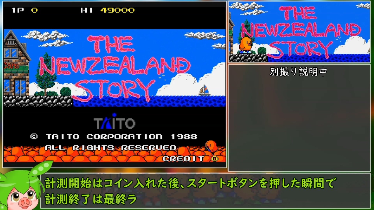 アーケード版ニュージーランドストーリーのRTA動画です。<br>speedrun.comに申請してたけど連射機だめらしいので取り下げました(下記参照)<br>読子はVOICEVOXずんだもん。<br><br>無編集版:<a href="https://www.nicovideo.jp/watch/sm41271452" class="watch">sm41271452</a><br>MD版(初回):<a href="https://www.nicovideo.jp/watch/sm31529847" class="watch">sm31529847</a><br>MD版(再走):<a href="https://www.nicovideo.jp/watch/sm41209262" class="watch">sm41209262</a><br><br>2022/10/24追記①<br>外部のコントローラーによる連射は(speedrun.com共通の)ルールで禁止スよね<br>知らんかったけど…<br>とりあえず申請取り下げてイーグレットツーミニには<br>ショットのみ連射機能付いているんでその範囲で走り直すヨ<br><br>2022/10/24追記②<br>ということで5時間くらい粘ったらできたよ(8m10s)<br>speedrun.comに申請したもので、2022/11/7時点で1位のタイムになります。<br>投稿者コメントで解説も付けておきます⇒<a href="https://www.nicovideo.jp/watch/sm41275839" class="watch">sm41275839</a><br><br />実況以外の投稿動画まとめマイリス:<a href="https://www.nicovideo.jp/mylist/73860319" target="_blank" rel="noopener">mylist/73860319</a><br><br>日曜日を除く21時~23時にゲーム中心の生放送をしています。<br>