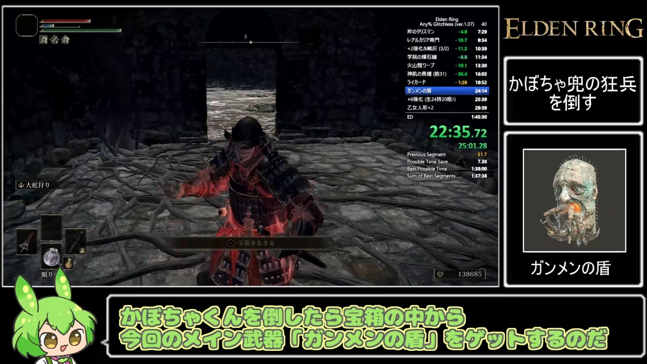 バグなしで走るのは初めてなので初投稿です<br><br>ver1.07です。ガンメンの盾でバグなしでクリアを目指します。RTAは1:32:16です<br>※ Speedrun.comのバグなしのルールを元に走っています。<br><br>前 → <a href="https://www.nicovideo.jp/watch/sm41126445" class="watch">sm41126445</a><br>次 → <a href="https://www.nicovideo.jp/watch/sm41307740" class="watch">sm41307740</a><br><br>元動画(編集なし) <a href="http://youtu.be/NytYK0k_-fs" target="_blank" rel="noopener nofollow">http://youtu.be/NytYK0k_-fs</a><br>Twitter <a href="https://twitter.com/Hamaa7_" target="_blank" rel="noopener nofollow">https://twitter.com/Hamaa7_</a><br><br>Part1まとめ <a href="https://www.nicovideo.jp/mylist/73580294" target="_blank" rel="noopener nofollow">https://www.nicovideo.jp/mylist/73580294</a><br><br>VOICEVOX:ずんだもん <a href="https://voicevox.hiroshiba.jp" target="_blank" rel="noopener nofollow">https://voicevox.hiroshiba.jp</a><br>ずんだもん立ち絵 <a href="https://seiga.nicovideo.jp/seiga/im10887998" target="_blank" rel="noopener nofollow">https://seiga.nicovideo.jp/seiga/im10887998</a>