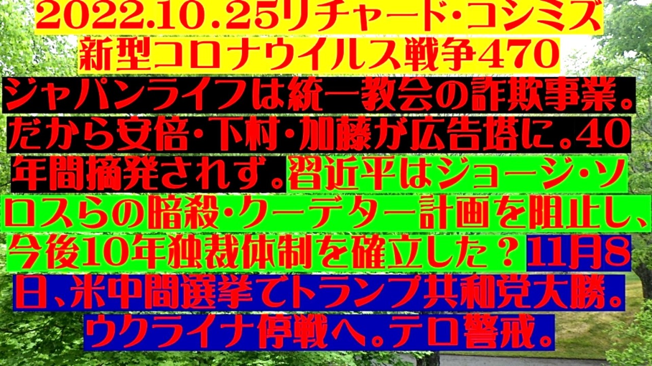 <span style="color: #cc4125;"><strong>「 テーマ:新型コロナウイルス戦争 470 」</strong></span><br><br><span style="color: #ff0000;"><strong>「『 ジャパンライフは、統一教会の詐欺事業 』。だから、『 安倍晋三・下村博文・加藤勝信 』が広告塔に。<br> 40年間摘発されず。習近平は、『 ジョージ・ソロスらの暗殺・クーデター計画 』を阻止し、今後10年<br> 独裁体制を確立した?『 11月8日、米国中間選挙でドナルド・トランプ共和党大勝 』。<br> ウクライナ停戦へ。テロ警戒 」</strong></span><br><br><strong>*「フォロー」・「ニコニ広告」・「いいね!」・「情報拡散」等、ご協力下さい。 リチャード・コシミズ</strong><br><br><span style="color: #38761d;">◆</span><span style="color: #38761d;"><strong>リチャード・コシミズ 公式 ブログ</strong></span><br> <a href="https://richard-koshimizu.jimdosite.com/" target="_blank" rel="noopener nofollow">https://richard-koshimizu.jimdosite.com/</a><br><br><span style="color: #38761d;">◆</span><span style="color: #38761d;"><strong>リチャード・コシミズ 公式 ホームページ<br> </strong></span><a href="http://richardkoshimizu.boo.jp/" target="_blank" rel="noopener nofollow">http://richardkoshimizu.boo.jp/</a><br><br><span style="color: #38761d;">◆</span><span style="color: #38761d;"><strong>リチャード・コシミズ オンライン ショップ</strong></span><br> <a href="https://rkonline.shop-pro.jp/" target="_blank" rel="noopener nofollow">https://rkonline.shop-pro.jp/</a><br><br><span style="color: #38761d;">◆</span><span style="color: #38761d;"><strong>リチャード・コシミズ 講演会 公式 動画ギャラリー</strong></span><br> <a href="http://www.t-sskk.com/richardkoshimizu/video-gallery/index.html" target="_blank" rel="noopener nofollow">http://www.t-sskk.com/richardkoshimizu/video-gallery/index.html</a><br>