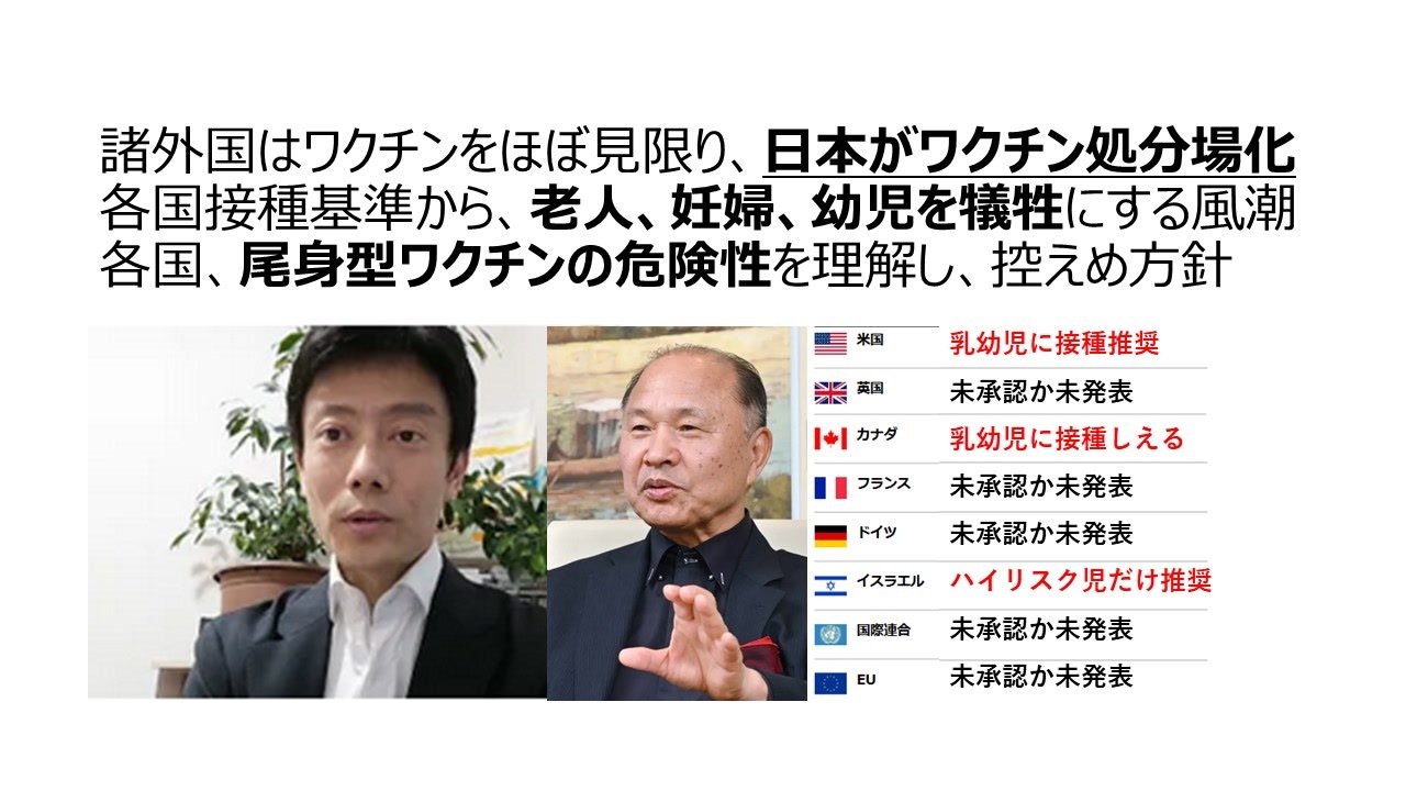 書類名:新規に接種が開始される新型コロナワクチンの 副反応に係る取扱いについて ワクチン分科会4年10/7<br><a href="https://www.mhlw.go.jp/content/10906000/001003623.pdf" target="_blank" rel="noopener nofollow">https://www.mhlw.go.jp/content/10906000/001003623.pdf</a><br><br>□乳幼児接種について<br>米国は推奨しているが、打たないと言える、カナダは接種しえるということで推奨なし<br>イスラエルもハイリスク児に限定。3つの全体主義国家でも限定している<br>英仏独EUは未発表、未承認。しかも日本だけ努力義務<br><br>新型コロナワクチンの接種については、新型コロナウイルス感染症の緊急のまん延予防のために実施する趣旨に鑑み、予防接種法上の「接種勧奨」及び「努力義務」の規定は原則として適用されることとなっています。<br><a href="https://www.cov19-vaccine.mhlw.go.jp/qa/0162.html" target="_blank" rel="noopener nofollow">https://www.cov19-vaccine.mhlw.go.jp/qa/0162.html</a><br><br>有効性:どんな効果がどれだけ続くか不明、しかも一定のお有効性が期待できると判断<br>1回目と2回目の効果は記載がない<br><br>安全性:スマートフォンを用いた積極的サーベイランスシステム<br>Vaccine Adverse Event Reporting System <br>アメリカの試験で0.073%の確率で死亡を含む重篤な有害事象が発生<br>※5 VAERSの報告のうち、入院、入院期間の延長、命にかかわる疾患、後遺障害、先天性異常又は欠損、及び死亡は、重篤に分類。<br> 23266件のうち、有害事象が1017件の重篤1.9件 この比率で乳幼児425万人に打つと3千人死が重篤となる<br><br>□尾身型ワクチンの各国対象<br>高齢者と子供と妊婦を殺そうとしている。特に高齢者と妊婦とハイリスク者。<br>弱い人が風邪にかからないように打たせるというが、弱い人ほど劇薬で死にやすい<br>アメリカが12歳以上に推奨<br>カナダは12歳以上は接種しえるだけ、高齢者は提供されるべき<br>幼児への従来型より、オミクロン型は、さらに打たせない指針が見える<br>(二価ワクチンは危ない証拠)<br>英国50歳以上、その他はハイリスク者、フランスも60歳以上とハイリスク者、ドイツ記載すらない<br>EUもハイリスク者優先と言いながら妊婦を含む<br>子供を増やさない計画 イスラエルも65歳以上推奨し、12歳は接種しえるとしつつなぜ妊婦が推奨<br><br>□副反応の継続的な追跡システムがない<br>1月しか見ないから死者が少なく見える仕掛け<br>英国の数字は60日見て捕捉 60日も短いため追跡必要<br><br>日本国独立宣言論 私は独立を宣言する 真田信秋(紙と電子書籍)<br><a href="https://www.amazon.co.jp/dp/B0CT86DX9G/" target="_blank" rel="noopener nofollow">https://www.amazon.co.jp/dp/B0CT86DX9G/</a>