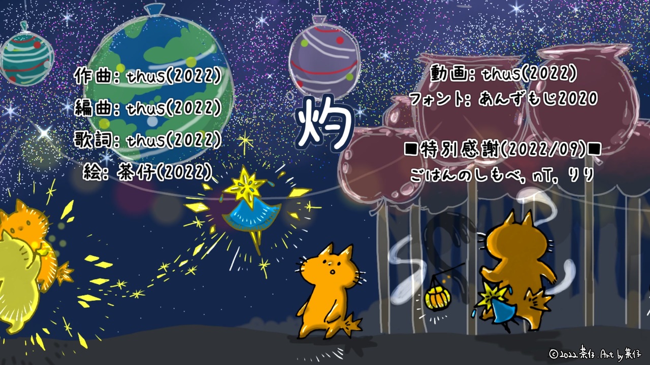 Art by 茶仔 © 2022 茶仔<br>(X:<a href="https://twitter.com/chacomalo" target="_blank" rel="noopener nofollow">https://twitter.com/chacomalo</a> )<br>―<br><br> どうも、灼なthusです。カラオケ動画:<a href="https://www.nicovideo.jp/watch/sm41293509" class="watch">sm41293509</a><br> 昨夜ライブ公開で殴り書いたことを、丁寧に書いてみます。<br> この曲は、ピアプロ公募のパズルゲーム第4弾に応募していた曲です。昨日17時半前に落選が分かったので、21時投稿に物凄く急いで間に合わせたというところです。投稿日である昨日はピアプロ公募落選結果発表のチキンレースで疲れていたので、その翌日に此処を書いています。<br> 応募曲を作っている時点で、茶仔さんの絵が絶対合うと、イマジナリーフレンド以来の直感が迸った私は今回復、茶仔さんに絵巻物の絵をお願いしまして、御快諾頂けました。色々遣り取りしつつ完成したのですが、何と今までで最も制作時間が長く掛けたそうで、大変畏れ多いと共に、大変有難う存じております。<br> 頂いたものを一目見ても何という力作。そして曲と合わせ出来上がった動画を見ると、やはり其はスペクタクルだったのです。だからこそ、今回どうしても投稿したかったのです。というのも、この回を逃すと次の投稿機会は来年2月だったのです。然し、応募中の楽曲は権利所在が曖昧になるので、公式に落選を確認しなければ曲の投稿ができません。<br> 斯くして先述の落選発表チキンレースが開催されました。此れ迄2年間弱のピアプロさんの音楽公募結果発表を見ると、(マジミラを除き)粗必ず金曜日か月曜日の17時に結果を発表されていることが分かりました。然し、結果発表予定は2022/10。当時10/28(金)と10/31(月)何方もあり得ました。そして私の楽曲投稿のスケジュール上、10/28(金)より先に延ばすのはもう不可能だったので、10/28(金)の17時が運命の刻でした。17時半に結果が発表されて「やった投稿できる!」と思うと同時に、予約投稿の庶務を3時間以内に全て済ませる必要があり、其処からまた煉獄な東奔西走に追われ…。<br> そして無事、共同作品としての「灼」が昨日こうして日の目を浴びることができました。本当に良かった良かったと、昨夜は魂が吸い取られ死んだように床に就きました。本当に良かった。復いつか共作出来たらと存じております。〆。<br><br>2022/10/29:1千→2,525→5千再生<br>//30:1万再生<br>/11/01:2万再生<br>//04:3万再生<br>//07:4万再生<br>//10:5万再生<br>//25:6万再生<br /><br><br><br>====================<br>| 2026/01/04 21:00「インスペクタの自死未遂」:<a href="https://www.nicovideo.jp/watch/sm45800854" class="watch">sm45800854</a><br>| 投稿曲マイリスト:<a href="https://www.nicovideo.jp/mylist/57867175" target="_blank" rel="noopener">mylist/57867175</a><br>|――――――――――――――――――<br>| pixivFANBOX:<a href="https://thus.fanbox.cc/" target="_blank" rel="noopener nofollow">https://thus.fanbox.cc/</a><br>| アルバム等配信中:<a href="https://thus-library.blogspot.com/search/label/discography" target="_blank" rel="noopener nofollow">https://thus-library.blogspot.com/search/label/discography</a><br>| つなぐ(依頼・リクエスト):<a href="https://tsunagu.cloud/users/thus" target="_blank" rel="noopener nofollow">https://tsunagu.cloud/users/thus</a><br>|――――――――――――――――――<br>| YouTube:<a href="https://youtube.com/@thus" target="_blank" rel="noopener nofollow">https://youtube.com/@thus</a><br>| X:<a href="https://x.com/thus_submission" target="_blank" rel="noopener nofollow">https://x.com/thus_submission</a><br>| 他全リンク:<a href="https://lit.link/thus" target="_blank" rel="noopener nofollow">https://lit.link/thus</a><br>|――――――――――――――――――<br>| オフボーカル等:<a href="https://piapro.jp/thus_999discommunication" target="_blank" rel="noopener nofollow">https://piapro.jp/thus_999discommunication</a><br>| 楽曲/動画の二次利用に関して:<a href="https://bit.ly/3JRQQiZ" target="_blank" rel="noopener nofollow">https://bit.ly/3JRQQiZ</a><br><span style="color: #262626;">| </span><span style="color: #262626;"><strong>歌詞図書館(ふりがな有るよ!):</strong></span><a href="https://thus-library.blogspot.com/" target="_blank" rel="noopener nofollow">https://thus-library.blogspot.com/</a><br>====================