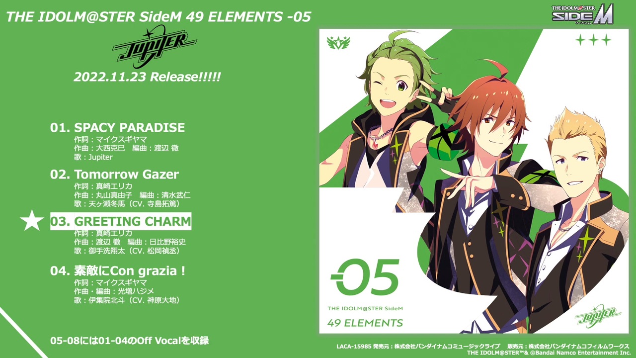 2022.11.23 RELEASE<br>THE IDOLM@STER SideM 49 ELEMENTS -05 Jupiter <br><br>歌:Jupiter [天ヶ瀬冬馬(CV.寺島拓篤), 御手洗翔太(CV.松岡禎丞), 伊集院北斗(CV.神原大地)]<br>販売価格:¥1,980(10%税込)/¥1,800(税抜)<br>品番:LACA-15985<br>発売元:株式会社バンダイナムコミュージックライブ <br>販売元:株式会社バンダイナムコフィルムワークス<br><br>Index★★★★<br>1.SPACY PARADISE<br>作詞:マイクスギヤマ 作曲:大西克巳 編曲:渡辺 徹<br>歌:Jupiter [天ヶ瀬冬馬(CV.寺島拓篤), 御手洗翔太(CV.松岡禎丞), 伊集院北斗(CV.神原大地)]<br><br>2.Tomorrow Gazer<br>作詞:真崎エリカ 作曲:丸山真由子 編曲:清水武仁<br>歌:天ヶ瀬冬馬(CV.寺島拓篤)<br><br>3.GREETING CHARM<br>作詞:真崎エリカ 作曲:渡辺 徹 編曲:日比野裕史<br>歌:御手洗翔太(CV.松岡禎丞)<br><br>4.素敵にCon grazia!<br>作詞:マイクスギヤマ 作曲・編曲:光増ハジメ<br>歌:伊集院北斗(CV.神原大地)<br> <br>5.SPACY PARADISE(Off Vocal)<br>6.Tomorrow Gazer(Off Vocal)<br>7.GREETING CHARM(Off Vocal)<br>8.素敵にCon grazia!(Off Vocal)<br><br>初回生産分にはランダムで1種(全3種)、各アイドルの特製ブロマイドを封入<br><br>THE IDOLM@STER™& ©Bandai Namco Entertainment Inc.