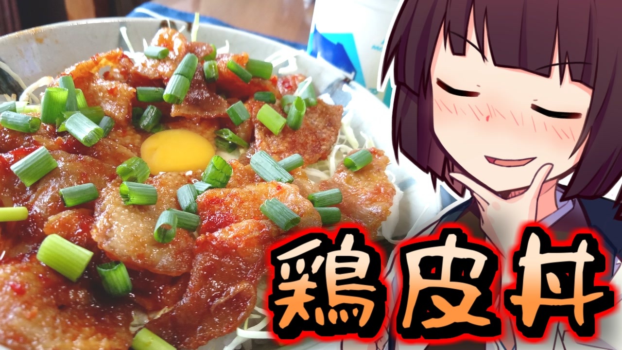料理本編は<a href="#" class="seekTime" data-seekTime="00:26" onclick="seekNicoPlayer('#00:26'); return false;">#00:26</a>からです。<br><br><br><材料(2人前)><br>鶏皮:200g<br>うずらの卵:2個<br>キャベツ:てきとー<br>万能ねぎ:てきとー<br><br>----------- A ------------<br>しょうゆ:大さじ1<br>酒:大さじ1<br>みりん:大さじ1<br>豆板醬:小さじ1<br>--------------------------<br><br><作り方(簡易版)><br>・鶏皮を多めの熱湯で5分茹でる。<br>・キャベツは千切り、万能ネギは小口切りにする。<br>・鶏皮をザルにあげ、流水で洗いながら脂肪や羽毛を取り除き、一口大に切る。<br>・フライパンで鶏皮を中火で焼き、別のフライパンで A を弱火に掛けておく。<br>・軽く焦げ目の付いた鶏皮を A の入ったフライパンに入れて絡める。<br>・丼に、ご飯・キャベツ・鶏皮・万能ネギ・うずらの卵を乗せる。