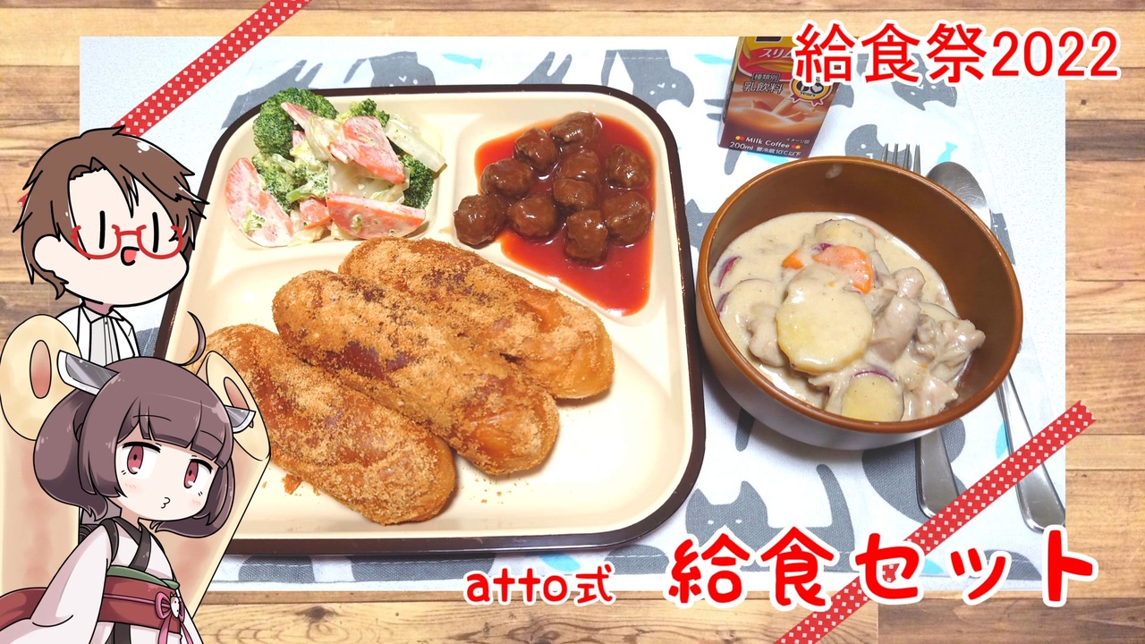 <span style="font-size: 16px;">今回は</span><span style="color: #ff0000; font-size: 16px;">飯テロ姉妹こと</span><span style="color: #ff0000; font-size: 18px;"><strong>Ru-aさんと縁さん主催</strong></span><span style="color: #ff0000; font-size: 24px;"><strong>「給食祭2022</strong></span><br><span style="color: #ff0000; font-size: 18px;"><strong>(</strong></span><a href="https://www.nicovideo.jp/watch/sm41115854" class="watch">sm41115854</a><span style="color: #ff0000; font-size: 18px;"><strong>)</strong></span><span style="color: #ff0000; font-size: 24px;"><strong>」</strong></span><span style="font-size: 16px;">の参加動画になります!</span><br>今回はうp主が好きな給食のメニューを含んだ給食セットになります。<br><br><span style="color: #4a86e8; font-size: 16px;"><strong>Twitter(趣味混同)➡</strong></span><a href="https://twitter.com/atto0415" target="_blank" rel="noopener nofollow">https://twitter.com/atto0415</a>