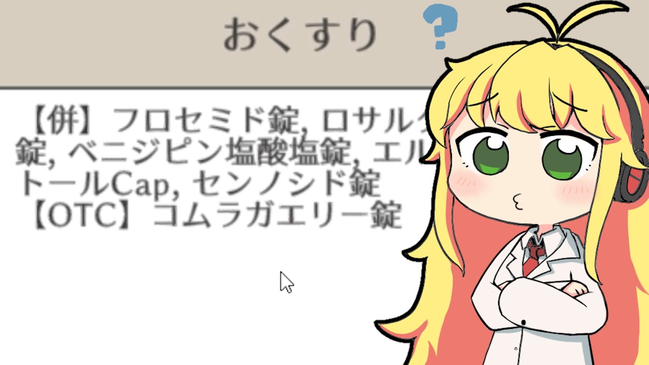 処方箋について疑わしい点があった時に薬剤師が処方医に問い合わせる、「疑義照会」をテーマにしたゲーム、「疑義照会ウォーズ」で遊びながら、登場する医薬品について解説していく動画です。<br><br>どちらかというと解説メインの動画なので、「解説・講座」ジャンルで投稿します。<br><br>プレイは生放送でやりました。アーカイブはこちら。<br><a href="https://www.youtube.com/watch?v=0txQa2U6r0o&t=3984s" target="_blank" rel="noopener nofollow">https://www.youtube.com/watch?v=0txQa2U6r0o&t=3984s</a><br><br><span style="font-size: 13px;">Youtube: <a href="https://www.youtube.com/channel/UCcLWyYVS3ysazvYjN7pKXuw" target="_blank" rel="noopener nofollow">https://www.youtube.com/channel/UCcLWyYVS3ysazvYjN7pKXuw</a> </span><br><span style="color: #262626;">Twitter: <a href="https://twitter.com/Iwashi_bibili" target="_blank" rel="noopener nofollow">https://twitter.com/Iwashi_bibili</a> </span><br><br> ================薬剤師マキの挑む薬剤師シミュレーター==================<br><span style="color: #0000ff; font-size: 13px;">マキ立ち絵:えびごはん 様( <a href="https://twitter.com/ebi_gohan" target="_blank" rel="noopener nofollow">https://twitter.com/ebi_gohan</a> ) <<オリジナル立ち絵のため配布しておりません>></span><span style="color: #0000ff;"> </span><br>ゲーム: 疑義照会ウォーズ(Steam <a href="https://store.steampowered.com/app/1799080/_/)" target="_blank" rel="noopener nofollow">https://store.steampowered.com/app/1799080/_/)</a>