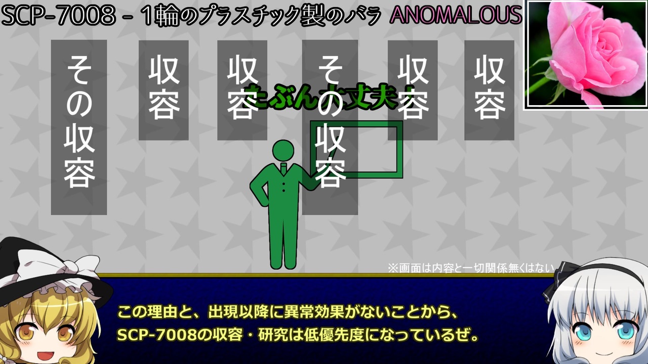 何にハマっているか分かりやすい編集<br><br>前→(<a href="https://www.nicovideo.jp/watch/sm41159039" class="watch">sm41159039</a>) マイリスト(<a href="https://www.nicovideo.jp/mylist/65586082" target="_blank" rel="noopener">mylist/65586082</a>) 次→(<a href="https://www.nicovideo.jp/watch/sm41592172" class="watch">sm41592172</a>) <br><br>【SCP紹介タイムアタック】→(<a href="https://www.nicovideo.jp/watch/sm36565739" class="watch">sm36565739</a>)<br>【東方二次創作】→(<a href="https://www.nicovideo.jp/mylist/68600326" target="_blank" rel="noopener">mylist/68600326</a>)<br>part1→(<a href="https://www.nicovideo.jp/watch/sm36271310" class="watch">sm36271310</a>)<br><br>SCP<br>Author: Limeyy 翻訳: walksoldi<br>Title: SCP-6653 - 無価値<br>Source: <a href="http://scp-jp.wikidot.com/scp-6653" target="_blank" rel="noopener nofollow">http://scp-jp.wikidot.com/scp-6653</a><br>CC BY-SA 3.0<br><br>Author: 匿名 翻訳: Witherite <br>Title: SCP-7008 - 1輪のプラスチック製のバラ<br>Source: <a href="http://scp-jp.wikidot.com/scp-7008" target="_blank" rel="noopener nofollow">http://scp-jp.wikidot.com/scp-7008</a><br>CC BY-SA 3.0<br><br>Author: Kothardarastrix 翻訳: Hasuma_S<br>Title: SCP-7328 - 宇宙人終来<br>Source: <a href="http://scp-jp.wikidot.com/scp-7328" target="_blank" rel="noopener nofollow">http://scp-jp.wikidot.com/scp-7328</a><br>CC BY-SA 3.0<br><br>SCP Foundation( <a href="http://www.scp-wiki.net/)" target="_blank" rel="noopener nofollow">http://www.scp-wiki.net/)</a><br>SCP財団(<a href="http://ja.scp-wiki.net/)" target="_blank" rel="noopener nofollow">http://ja.scp-wiki.net/)</a><br>CC-BY-SA 3.0<br><br>クレジット関係<br>動画 <a href="https://www.nicovideo.jp/watch/sm40499092" target="_blank" rel="noopener nofollow">https://www.nicovideo.jp/watch/sm40499092</a><br>動画 <a href="https://www.nicovideo.jp/watch/sm40465457" target="_blank" rel="noopener nofollow">https://www.nicovideo.jp/watch/sm40465457</a><br><br>東方project 上海アリス幻樂団 様<br><br>SCP財団からの引用は全てCC-BY-SA 3.0に基づきます。<br>