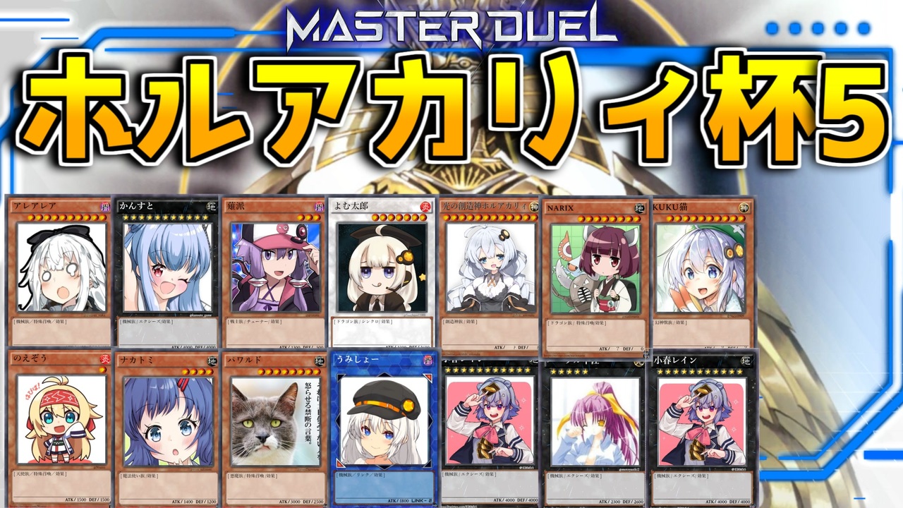 ー現代遊戯王が体感できる神ゲー「遊戯王マスターデュエル」の実況動画ー<br>☆三幻神を束ねることで召喚できる「光の創造神ホルアクティ」を求め続ける紲星あかりがマスターデュエルにもやってきた!!!<br><br>☆総勢14名のボイロ関係者がしのぎを削るトーナメント形式の大会!!<br>大会名は私が適当に提案したら採用されちゃったのだ(*'▽')<br><br>☆参加者(敬称略)<br>・四輝:<a href="https://twitter.com/shiki_yokosuka" target="_blank" rel="noopener nofollow">https://twitter.com/shiki_yokosuka</a><br>・KUKU猫:<a href="https://twitter.com/96cat0909" target="_blank" rel="noopener nofollow">https://twitter.com/96cat0909</a><br>・小春レイン:<a href="https://twitter.com/El8Mb5" target="_blank" rel="noopener nofollow">https://twitter.com/El8Mb5</a><br>・ぱたー:<a href="https://twitter.com/paterDM" target="_blank" rel="noopener nofollow">https://twitter.com/paterDM</a><br>・パープル中佐:<a href="https://twitter.com/motoyasiki2" target="_blank" rel="noopener nofollow">https://twitter.com/motoyasiki2</a><br>・薙派:<a href="https://twitter.com/arutana" target="_blank" rel="noopener nofollow">https://twitter.com/arutana</a><br>・よむ太郎:<a href="https://twitter.com/Sacchaso11000" target="_blank" rel="noopener nofollow">https://twitter.com/Sacchaso11000</a><br>・narix:<a href="https://twitter.com/narixnarix" target="_blank" rel="noopener nofollow">https://twitter.com/narixnarix</a><br>・かんすと:<a href="https://twitter.com/kansuto_game" target="_blank" rel="noopener nofollow">https://twitter.com/kansuto_game</a><br>・ナカトミ:<a href="https://twitter.com/voiro_nakatomi" target="_blank" rel="noopener nofollow">https://twitter.com/voiro_nakatomi</a><br>・パワルド:<a href="https://twitter.com/powerd5humohumo" target="_blank" rel="noopener nofollow">https://twitter.com/powerd5humohumo</a><br>・うみしょー:<a href="https://twitter.com/never110" target="_blank" rel="noopener nofollow">https://twitter.com/never110</a><br>・のえぞう:<a href="https://twitter.com/Noezo" target="_blank" rel="noopener nofollow">https://twitter.com/Noezo</a><br>・アレアレア:<a href="https://twitter.com/arearea_yuka" target="_blank" rel="noopener nofollow">https://twitter.com/arearea_yuka</a><br><br>マイリスト→<a href="https://www.nicovideo.jp/mylist/68429101" target="_blank" rel="noopener">mylist/68429101</a><br><br>☆素材元様☆<br>立ち絵<br> 紲星あかり:みるくぱんだ 様<br> ついなちゃん:akihiyo 様<br /><br><span style="color: #434343; font-size: 10px;">ついったー:<a href="https://twitter.com/shiki_yokosuka" target="_blank" rel="noopener nofollow">https://twitter.com/shiki_yokosuka</a></span>