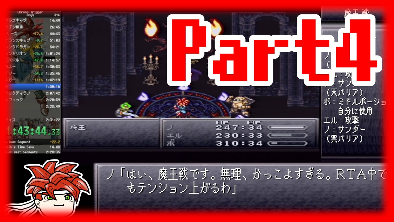 この世のすべての甘エビは人生の前半をオスとして過ごし人生の後半をメスとして過ごすらしいので初投稿です。<br>日本1位、世界3位の記録となっています。SRC → <a href="https://www.speedrun.com/ct#Any" target="_blank" rel="noopener nofollow">https://www.speedrun.com/ct#Any</a><br>参考にしたチャート → <a href="http://chrono.wikidot.com/ct-jp" target="_blank" rel="noopener nofollow">http://chrono.wikidot.com/ct-jp</a><br>※英語です<br><br>2022/11/03 人は過ちを繰り返す、、、。編集ミスがまたあったので修正します。ごめんね。<br><span style="color: #ff0000; font-size: 24px;">2022/11/04 修正したのに修正前の動画で上書きするというガバをやらかしました。許してください。なんでもしまむら</span><br><span style="color: #262626; font-size: 18px;">今度こそ修正できているはず…。ミスを教えてくれたコメがあってもそんなミスがあったんだな程度に思ってください…。</span><br><br>2022/11/10 パート5上がりました!またパート4の広告してくれた方々本当にありがとうございます!!<br><br><br>part3 → <a href="https://www.nicovideo.jp/watch/sm41289331" class="watch">sm41289331</a> part5 → <a href="https://www.nicovideo.jp/watch/sm41354815" class="watch">sm41354815</a> マイリス → <a href="https://www.nicovideo.jp/mylist/73882625" target="_blank" rel="noopener">mylist/73882625</a><br><br><br><a target="_blank" href="https://qa.nicovideo.jp/faq/show/19424?site_domain=default" style="font-size: 13px;color: #657586; text-decoration: underline; line-height: 1.4">この動画は投稿者によって修正されました</a>