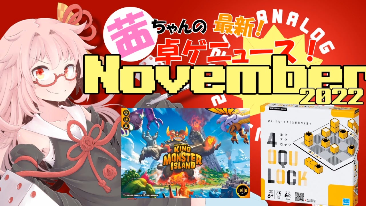 5周年に遅刻!!!!!!!!!<br>すみませんでした!!!!!!!<br><span style="font-size: 10px;">※毛筆フォントは玉ねぎR氏の</span><span style="font-size: 10px;"><strong>「玉ねぎ楷書」</strong></span><span style="font-size: 10px;">をお借りしております</span><br><br><a href="https://www.nicovideo.jp/watch/sm41159318" class="watch">sm41159318</a> ←前 次→ 今度こそ<strong>11月末!</strong><br><br><span style="font-size: 10px;">キングオブトーキョーシリーズ紹介:<a href="https://www.nicovideo.jp/watch/sm39330181" class="watch">sm39330181</a><br>「ゴールデンアニマル」公式:<br><a href="https://jelly2games.com/goldenanimals" target="_blank" rel="noopener nofollow">https://jelly2games.com/goldenanimals</a><br>「ヨンオクロック」公式:<br><a href="https://www.kawada-toys.com/brand/game/catalog/kbg-11/" target="_blank" rel="noopener nofollow">https://www.kawada-toys.com/brand/game/catalog/kbg-11/</a></span><br><br><span style="font-size: 10px;"><strong>■関連情報(日本語情報がないのでニュースサイトのもの)</strong></span><br><span style="font-size: 10px;">「Slay the Spire: The Board Game」Kickstarter開始<br><a href="https://www.4gamer.net/games/546/G054695/20221102069/" target="_blank" rel="noopener nofollow">https://www.4gamer.net/games/546/G054695/20221102069/</a><br><br>「両手いっぱいに芋の花を」初見プレイきりたん シリーズ:<a href="https://www.nicovideo.jp/series/312394" target="_blank" rel="noopener">series/312394</a><br>茜ちゃんのアナログゲームニュース:<a href="https://www.nicovideo.jp/mylist/60425910" target="_blank" rel="noopener">mylist/60425910</a> <br>VOICEROIDボードゲーム動画:<a href="https://www.nicovideo.jp/mylist/69531602" target="_blank" rel="noopener">mylist/69531602</a><br>投稿者のDiscordサーバー:<a href="https://discord.gg/DFySkdS" target="_blank" rel="noopener nofollow">https://discord.gg/DFySkdS</a></span>