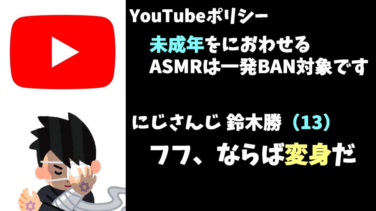 2022年10月31日、にじさんじ所属の鈴木勝くんが6月に改訂されたYouTubeポリシー対策としてASMRの時には変身していくことをYouTubeコミュニティにて発表されました。未成年をにおわせながらのASMRは過去に少なくとも5名以上のバーチャルYouTuberのチャンネル停止の原因になったとされています。<br><br>引用元<br>勝君のコミュニティ<br><a href="https://www.youtube.com/c/DarknessEater/community" target="_blank" rel="noopener nofollow">https://www.youtube.com/c/DarknessEater/community</a><br><br>Youtube <a href="https://www.youtube.com/channel/UCzYQPx8MeE99DUkW9Y_txJw" target="_blank" rel="noopener nofollow">https://www.youtube.com/channel/UCzYQPx8MeE99DUkW9Y_txJw</a><br>twitter <a href="https://twitter.com/V_Virgin_Mary" target="_blank" rel="noopener nofollow">https://twitter.com/V_Virgin_Mary</a><br><br>使用素材<br>高品質なフリー動画素材 - Pixabay <a href="https://pixabay.com/ja/videos" target="_blank" rel="noopener nofollow">https://pixabay.com/ja/videos</a><br>いらすとや様 <a href="https://www.irasutoya.com/" target="_blank" rel="noopener nofollow">https://www.irasutoya.com/</a>