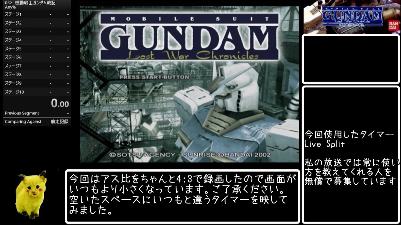 モチベが続かず動画の体裁が保てないと判断しRTA(風)としました。<br>現在レギュなどもないのでこれをひな型に誰か確立してくれてもいいのよ?<br>連邦編を上げる予定は今の所ないです<br>間違えてSEEDのRTAのシリーズに追加していました。すみません<br><br>無編集版 <a href="https://youtu.be/5kceLLGuPdc" target="_blank" rel="noopener nofollow">https://youtu.be/5kceLLGuPdc</a><br><br>プレイ環境<br>実機 PSCH-50000<br><br>録画環境<br>キャプチャ機器 GV-USB2 S端子<br>キャプチャソフト アマレコTV4.11<br>録画ソフト OBS28.0.3<br><br>次回 <a href="https://www.nicovideo.jp/watch/sm41349314" class="watch">sm41349314</a><br><br>今まで上げたRTA Part1リンク<a href="https://www.nicovideo.jp/mylist/71360071" target="_blank" rel="noopener">mylist/71360071</a><br><br>ガンダムゲーのRTA Part1リンク<a href="https://www.nicovideo.jp/mylist/73997183" target="_blank" rel="noopener">mylist/73997183</a>