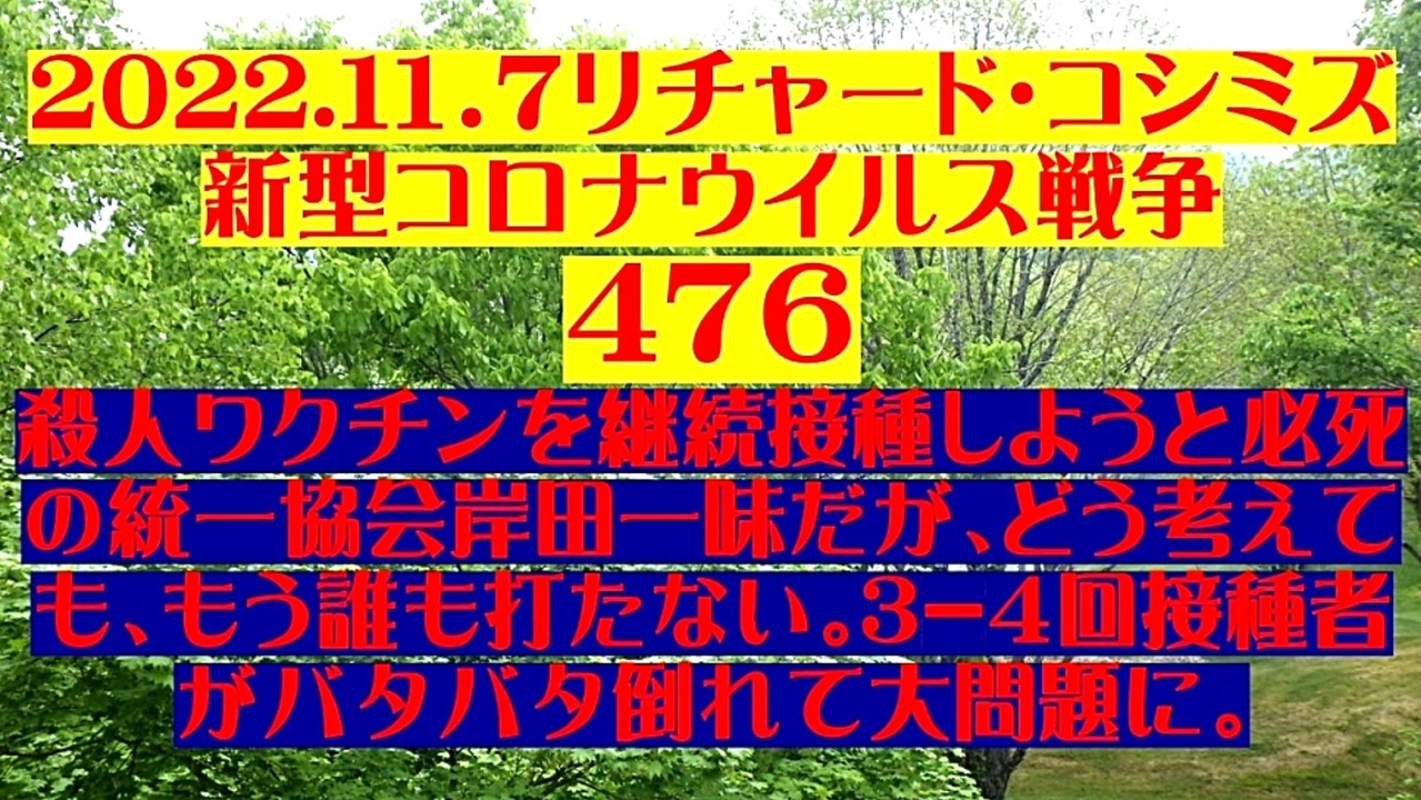 <span style="color: #cc4125;"><strong>「 テーマ:新型コロナウイルス戦争 476 」</strong></span><br><br><span style="color: #ff0000;"><strong>「『 殺人ワクチンを継続接種 』しようと必死の『 統一協会・岸田文雄一味 』だが、どう考えても、<br> もう、誰も打たない。『 3~4回ワクチン接種者が、バタバタ倒れて大問題に! 』」</strong></span><br><br><span style="color: #0000ff;"><strong>「『 イベルメクチン・アビガン・その他コロナ対策についてのご意見 』をお寄せ下さい! 」</strong></span><br><br> <strong>◐ E-mail:richardkoshimizu@gmail.com<br><br>*「フォロー」・「ニコニ広告」・「いいね!」・「情報拡散」等、ご協力下さい。 リチャード・コシミズ</strong><br><br><span style="color: #38761d;">◆</span><span style="color: #38761d;"><strong>リチャード・コシミズ 公式 ブログ</strong></span><br> <a href="https://richard-koshimizu.jimdosite.com/" target="_blank" rel="noopener nofollow">https://richard-koshimizu.jimdosite.com/</a><br><br><span style="color: #38761d;">◆</span><span style="color: #38761d;"><strong>リチャード・コシミズ 公式 ホームページ<br> </strong></span><a href="http://richardkoshimizu.boo.jp/" target="_blank" rel="noopener nofollow">http://richardkoshimizu.boo.jp/</a><br><br><span style="color: #38761d;">◆</span><span style="color: #38761d;"><strong>リチャード・コシミズ オンライン ショップ</strong></span><br> <a href="https://rkonline.shop-pro.jp/" target="_blank" rel="noopener nofollow">https://rkonline.shop-pro.jp/</a><br><br><span style="color: #38761d;">◆</span><span style="color: #38761d;"><strong>リチャード・コシミズ 講演会 公式 動画ギャラリー</strong></span><br> <a href="http://www.t-sskk.com/richardkoshimizu/video-gallery/index.html" target="_blank" rel="noopener nofollow">http://www.t-sskk.com/richardkoshimizu/video-gallery/index.html</a><br>