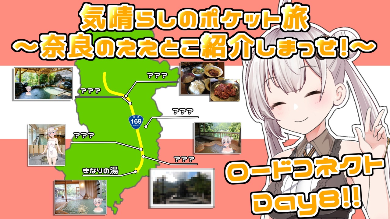 <strong>【ロードコネクトDay8】<br>気晴らしのポケット旅 奈良のええとこ紹介しまっせ~!</strong><br><br>ご視聴頂きありがとうございます!<br><span style="color: #ff0000;"><strong>ロードコネクト8日目!</strong></span><br>奈良の南東部辺dり<br>国道169号沿いにあるスポットを紹介していきます!<br><br>撮影は夏にしておりますので<br>現在の気温や状況と違う事がありますので<br>行かれる際にはご確認お願い致します!<br><br><span style="color: #ff0000;">ロードコネクト</span><br>Day7>michael(ミカエル)さん <a href="https://www.nicovideo.jp/watch/sm41281687" class="watch">sm41281687</a><br><a href="https://www.nicovideo.jp/user/1599482" target="_blank" rel="noopener">user/1599482</a><br><br>Day9>FUMIさん <a href="https://www.nicovideo.jp/watch/sm41322756" class="watch">sm41322756</a><br><a href="https://www.nicovideo.jp/user/34839405" target="_blank" rel="noopener">user/34839405</a><br><br>ロードコネクトマイリストリンク<br><a href="https://www.nicovideo.jp/user/92595775/mylist/73892938" target="_blank" rel="noopener nofollow">https://www.nicovideo.jp/user/92595775/mylist/73892938</a><br><br><br>ほとんど呟かないTwitter<br><a href="https://mobile.twitter.com/fireball0126" target="_blank" rel="noopener nofollow">https://mobile.twitter.com/fireball0126</a><br><br>YouTubeの動画リスト<br><a href="https://www.youtube.com/channel/UCt9l0esvO_VXK30BHqKQoVg/videos" target="_blank" rel="noopener nofollow">https://www.youtube.com/channel/UCt9l0esvO_VXK30BHqKQoVg/videos</a><br><br>お借りした一覧<br><br>立ち絵<br><br>紲星あかり <br>デフォルメノシバン こんにゃく様<br><br>デフォルメ dairi&はるか様<br><br>編集ソフト等<br><br>AviUtl<br>PSDToolKit<br>SoTtalk<br>ペイントツールSAI<br><br><br><br>前回><a href="https://www.nicovideo.jp/watch/sm41310450" class="watch">sm41310450</a><br>次回>制作中<br>マイリスト><a href="https://www.nicovideo.jp/mylist/64925619" target="_blank" rel="noopener">mylist/64925619</a><br>