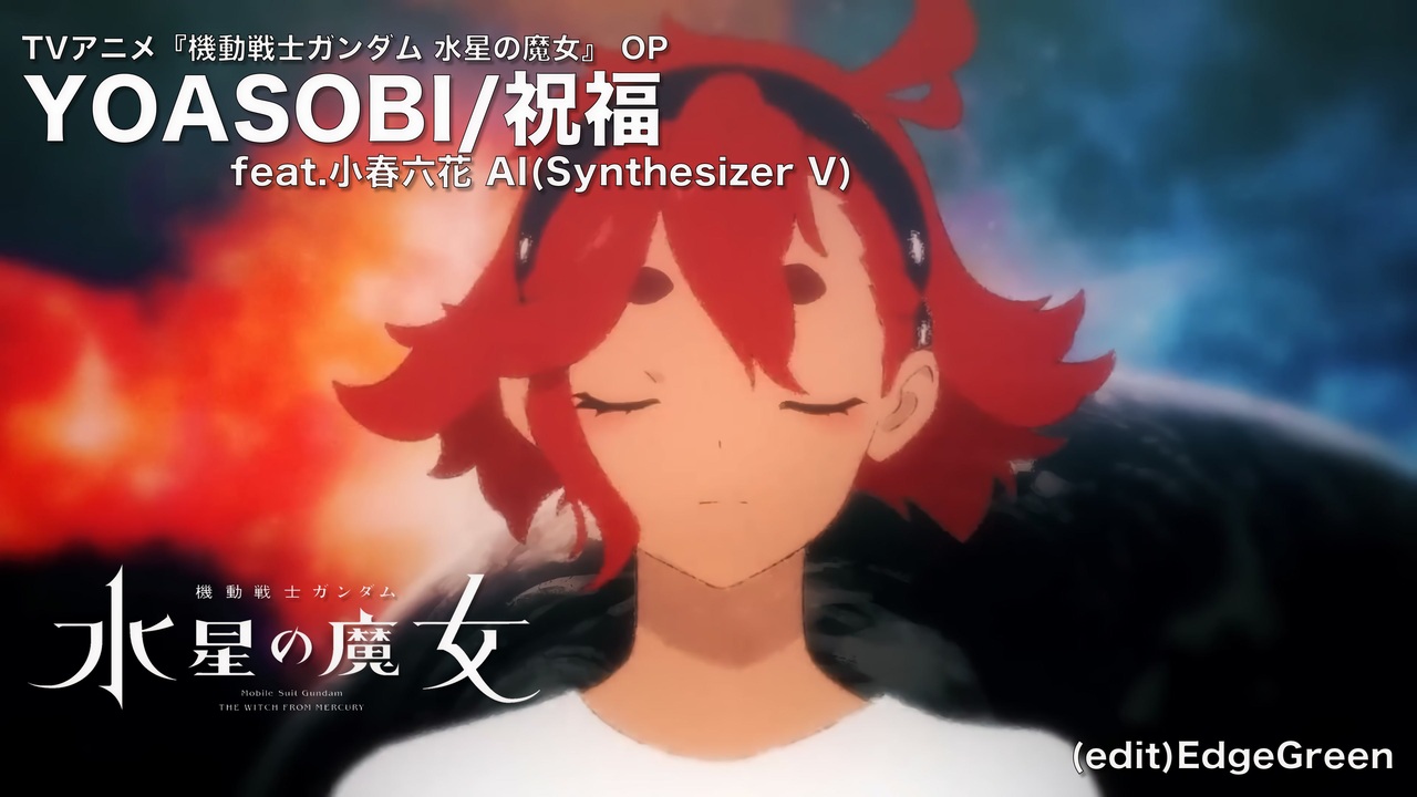 TVアニメ『機動戦士ガンダム 水星の魔女』 OP<br><a href="https://g-witch.net/" target="_blank" rel="noopener nofollow">https://g-witch.net/</a><br><br>[バーチャルシンガー]<br>Main vo.:小春六花 AI(Synthesizer V)<br> Sub vo.:夏色花梨(Synthesizer V AI)<br><br>[Youtube]<br><a href="https://youtu.be/DvT8YYrCiF0" target="_blank" rel="noopener nofollow">https://youtu.be/DvT8YYrCiF0</a><br><br>[楽曲] 祝福<br>作詞、作曲:Ayase<br><br>[配信] Apple Music<br>YOASOBI/祝福 - Single<br><a href="https://music.apple.com/jp/album/%E7%A5%9D%E7%A6%8F-single/1645308325" target="_blank" rel="noopener nofollow">https://music.apple.com/jp/album/%E7%A5%9D%E7%A6%8F-single/1645308325</a><br><br>[アーティスト] YOASOBI<br>(HP)<a href="https://www.yoasobi-music.jp/" target="_blank" rel="noopener nofollow">https://www.yoasobi-music.jp/</a><br>(MV)<a href="https://youtu.be/3eytpBOkOFA" target="_blank" rel="noopener nofollow">https://youtu.be/3eytpBOkOFA</a>