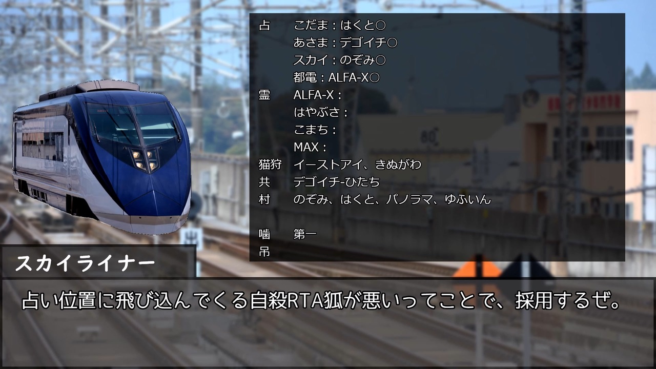 上越新幹線の開業記念日ということで。<br><br>初日の議論時間を長くし過ぎた…!<br>17C猫FO村、開演です。<br><br>17C猫FO 村1/占2/霊2/狩1/猫1/共2/狼4/狂2/狐2<br><br><a href="#" class="seekTime" data-seekTime="12:58" onclick="seekNicoPlayer('#12:58'); return false;">#12:58</a> 頃 グレー広いがグレー狭いになってる…修正します<br>⇒16:50 修正しました<br><br>Twitterで考察して頂ける方は#電車で人狼 を入れて呟いていただけると探しやすいです。<br>前村⇒<a href="https://www.nicovideo.jp/watch/sm41155369" class="watch">sm41155369</a> 3日目⇒<a href="https://www.nicovideo.jp/watch/sm41406235" class="watch">sm41406235</a> 11/23 10:33<br><br>電車で人狼!マイリスト <a href="https://www.nicovideo.jp/mylist/72946958" target="_blank" rel="noopener">mylist/72946958</a><br>電車で人狼! 支線編(解説動画) <a href="https://www.nicovideo.jp/mylist/79077747" target="_blank" rel="noopener">mylist/79077747</a><br>人狼動物園マイリスト <a href="https://www.nicovideo.jp/mylist/72986089" target="_blank" rel="noopener">mylist/72986089</a><br><br><a target="_blank" href="https://qa.nicovideo.jp/faq/show/19424?site_domain=default" style="font-size: 13px;color: #657586; text-decoration: underline; line-height: 1.4">この動画は投稿者によって修正されました</a>