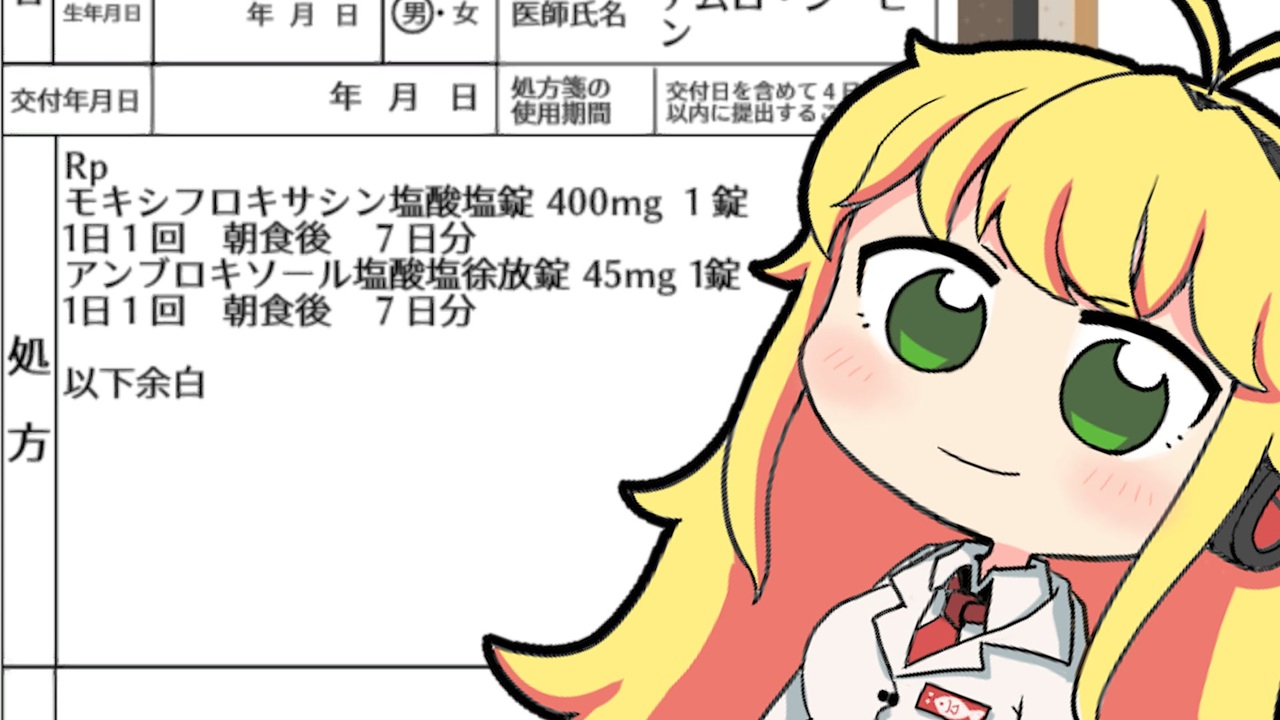 処方箋について疑わしい点があった時に薬剤師が処方医に問い合わせる、「疑義照会」をテーマにしたゲーム、「疑義照会ウォーズ」で遊びながら、登場する医薬品について解説していく動画です。<br><br>どちらかというと解説メインの動画なので、「解説・講座」ジャンルで投稿します。<br><br><span style="color: #0000ff; font-size: 16px;"><strong>いいねをするとプチお薬解説が見れるぞ!</strong></span><br><br>プレイは生放送でやりました。アーカイブはこちら。<br><a href="https://www.youtube.com/watch?v=0txQa2U6r0o&t=3984s" target="_blank" rel="noopener nofollow">https://www.youtube.com/watch?v=0txQa2U6r0o&t=3984s</a><br><br><span style="font-size: 13px;">Youtube: <a href="https://www.youtube.com/channel/UCcLWyYVS3ysazvYjN7pKXuw" target="_blank" rel="noopener nofollow">https://www.youtube.com/channel/UCcLWyYVS3ysazvYjN7pKXuw</a> </span><br><span style="color: #262626;">Twitter: <a href="https://twitter.com/Iwashi_bibili" target="_blank" rel="noopener nofollow">https://twitter.com/Iwashi_bibili</a> <br><br>使用ソフト<br>Premiere Pro<br>After Effects<br>VOICEROID2<br>VoiceroidUtil<br>2dActorTools</span><br><br> ================薬剤師マキの挑む薬剤師シミュレーター==================<br><span style="color: #0000ff; font-size: 13px;">マキ立ち絵:えびごはん 様( <a href="https://twitter.com/ebi_gohan" target="_blank" rel="noopener nofollow">https://twitter.com/ebi_gohan</a> ) <<オリジナル立ち絵のため配布しておりません>></span><span style="color: #0000ff;"> </span><br>ゲーム: 疑義照会ウォーズ(Steam <a href="https://store.steampowered.com/app/1799080/_/)" target="_blank" rel="noopener nofollow">https://store.steampowered.com/app/1799080/_/)</a>