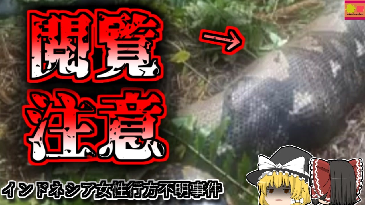 インドネシアではこの日、ゴム農園で働く女性「Aさん」が、仕事の帰り道に忽然と姿を消すという、失踪事件が発生していました。<br>農園を経営する夫は、彼女が戻らないことを不審に思い、帰路を捜索すると、森の中でAさんの当時持っていたであろう、仕事用ナイフや靴などがその場に残されていました。<br>彼はすぐに地元警察に通報し、地域住民協力のもと、Aさんの捜索が開始されました。<br>しかし、この日は結局発見することができず。<br>翌日も早朝から捜索が開始され、それは近くにあるジャングルにまで及びました。<br>そして、そこにはこれまで見たことがないほど、大きくお腹を膨らませた大蛇が横たわっていました。<br><br><a href="#" class="seekTime" data-seekTime="00:00" onclick="seekNicoPlayer('#00:00'); return false;">#00:00</a> 冒頭挨拶<br><a href="#" class="seekTime" data-seekTime="00:28" onclick="seekNicoPlayer('#00:28'); return false;">#00:28</a> 視聴上の注意<br><a href="#" class="seekTime" data-seekTime="1:08" onclick="seekNicoPlayer('#1:08'); return false;">#1:08</a> 現地の説明<br><a href="#" class="seekTime" data-seekTime="2:28" onclick="seekNicoPlayer('#2:28'); return false;">#2:28</a> ゴム農園で働く女性「Aさん」の失踪<br><a href="#" class="seekTime" data-seekTime="4:11" onclick="seekNicoPlayer('#4:11'); return false;">#4:11</a> 発見された「異様な蛇」<br><a href="#" class="seekTime" data-seekTime="5:25" onclick="seekNicoPlayer('#5:25'); return false;">#5:25</a> 森で襲われていた可能性<br><a href="#" class="seekTime" data-seekTime="5:50" onclick="seekNicoPlayer('#5:50'); return false;">#5:50</a> 不思議な点も<br><a href="#" class="seekTime" data-seekTime="7:19" onclick="seekNicoPlayer('#7:19'); return false;">#7:19</a> アミメニシキヘビ<br><a href="#" class="seekTime" data-seekTime="8:55" onclick="seekNicoPlayer('#8:55'); return false;">#8:55</a> 過去にも事故が起きていた<br><br><br><br>引用・出展・参考文献<br>The Sun<br><a href="https://ishort.ink/hNxP" target="_blank" rel="noopener nofollow">https://ishort.ink/hNxP</a><br>NEW YORK POST<br><a href="https://ishort.ink/TQwH" target="_blank" rel="noopener nofollow">https://ishort.ink/TQwH</a><br>NATIONAL GEOGRAPHIC<br><a href="https://ishort.ink/vBtu" target="_blank" rel="noopener nofollow">https://ishort.ink/vBtu</a><br>その他視聴者提供資料など<br><br><br><br><br />※この動画は過去の事件を知り、現在でも同じことが発生する危険性を再認識、関与しないように促すための動画であり、視聴者を扇動、動揺を誘うためのコンテンツではありません。<br><br>ご要望にお応えして、メンバーシップの開設を行いました。<br>下記URLからも登録可能ですので、ご興味がある方は是非ご参加ください。<br><a href="https://www.youtube.com/channel/UCcT5a1J7XJW7CLYI2RKl4pw/join" target="_blank" rel="noopener nofollow">https://www.youtube.com/channel/UCcT5a1J7XJW7CLYI2RKl4pw/join</a><br><br><br>Twitter<br>→<a href="https://twitter.com/yukkurisurutoko" target="_blank" rel="noopener nofollow">https://twitter.com/yukkurisurutoko</a><br><br>取り急ぎ、簡易的にですがマイリストを作りました。<br>【ゆっくり解説】事故・事件関係紹介リスト <br><a href="https://www.nicovideo.jp/mylist/71034319" target="_blank" rel="noopener nofollow">https://www.nicovideo.jp/mylist/71034319</a><br>【ゆっくり解説】放射線系事故<br><a href="https://www.nicovideo.jp/mylist/71034368" target="_blank" rel="noopener nofollow">https://www.nicovideo.jp/mylist/71034368</a><br>【ゆっくり解説】鉄道系事故・事件関連<br><a href="https://www.nicovideo.jp/mylist/71034379" target="_blank" rel="noopener nofollow">https://www.nicovideo.jp/mylist/71034379</a>
