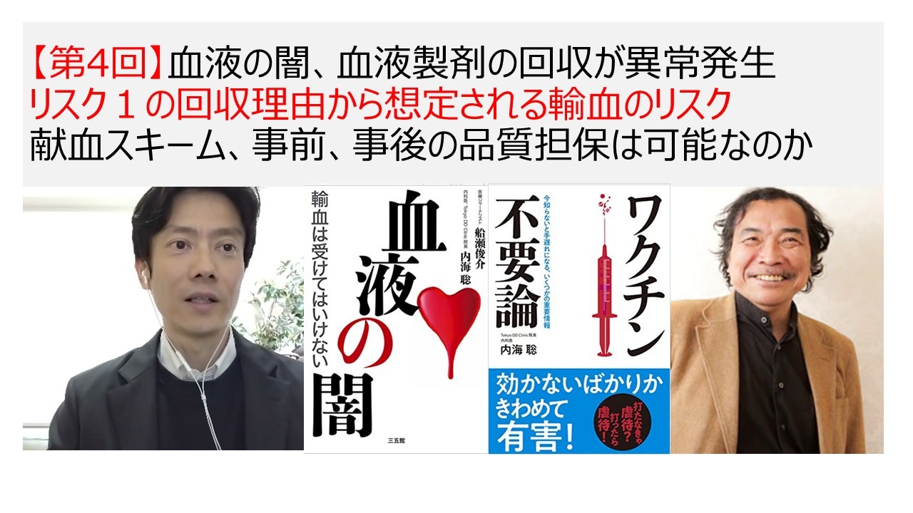 一回目 <a href="https://www.nicovideo.jp/watch/sm41097163" target="_blank" rel="noopener nofollow">https://www.nicovideo.jp/watch/sm41097163</a><br>続 <a href="https://www.nicovideo.jp/watch/sm41375532" target="_blank" rel="noopener nofollow">https://www.nicovideo.jp/watch/sm41375532</a><br>続々 <a href="https://www.nicovideo.jp/watch/sm41885678" target="_blank" rel="noopener nofollow">https://www.nicovideo.jp/watch/sm41885678</a><br>4回目 <a href="https://www.nicovideo.jp/watch/sm41920382" target="_blank" rel="noopener nofollow">https://www.nicovideo.jp/watch/sm41920382</a><br><br>赤十字のサイトに若干の変更あり <a href="https://www.jrc.or.jp/donation/about/refrain/detail_08/" target="_blank" rel="noopener nofollow">https://www.jrc.or.jp/donation/about/refrain/detail_08/</a><br>インフルエンザ、日本脳炎、コレラ、A型肝炎、肺炎球菌、百日ぜき、破傷風等の不活化ワクチン及びトキソイドの接種を受けた方は、接種後24時間の献血をご遠慮いただいています<br>B型肝炎ワクチンの接種を受けた方は接種後2週間、抗HBs人免疫グロブリンを単独または併用した方については投与後6カ月間、狂犬病ワクチン(動物にかまれた後)を接種された方は接種後1年間の献血をご遠慮いただいています<br>おたふくかぜ、風疹、BCG等の弱毒生ワクチンの接種を受けた方は、接種後4週間、天然痘ワクチンの接種後は2カ月間、破傷風、蛇毒、ガスえそ、ボツリヌスの抗血清の投与を受けた方は投与後3カ月の献血をご遠慮いただいています。新型コロナウイルスのワクチンを接種された方は次のとおりです<br><br>【RNAワクチン(mRNAワクチンを含む)】接種後48時間を経過していれば献血にご協力いただけます。 例)ファイザー社、モデルナ社 ※オミクロン株対応のワクチンを含む<br>【ウイルスベクターワクチン】接種後6週間を経過していれば、献血にご協力いただくことが可能です)アストラゼネカ社、J&J(ヤンセンファーマ)<br><br>※今後、新たに承認される新型コロナウイルスのワクチンについて、その有効成分の特性によっては、国の審議会等での検討が必要となり、接種後の献血受入基準が定められるまで、献血をお控えいただく場合があります。また、上記以外のワクチンタイプは現時点で受入基準がないことから、献血をお控えいただくこととしています。<br><br>大橋眞先生の特例承認取消訴訟のサイト <a href="https://vimeo.com/581227039" target="_blank" rel="noopener nofollow">https://vimeo.com/581227039</a><br><br>徳島大学 大橋氏の見解などは本学と一切関係ございません。<br><a href="https://www.tokushima-u.ac.jp/docs/22379.html" target="_blank" rel="noopener nofollow">https://www.tokushima-u.ac.jp/docs/22379.html</a><br><br>日本国独立宣言論 私は独立を宣言する! 真田信秋<br><a href="https://amzn.to/3D90lwx" target="_blank" rel="noopener nofollow">https://amzn.to/3D90lwx</a><br> <br>主権者命令書 主権破壊を許すな 売国傀儡日本政府を解体せよ<br><a href="https://amzn.to/49z51b5" target="_blank" rel="noopener nofollow">https://amzn.to/49z51b5</a>