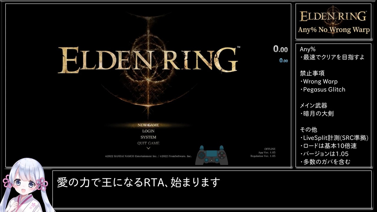 SEKIRO以外は初投稿です。<br><br>■カテゴリ|Any% No Wrong Warp<br>・Wrong Warp / Pegasus Glitchは禁止<br>・メイン武器は暗月の大剣を使用<br>・なんでもいいから速くクリアする<br>・IGT計測 (RTも同時計測。こちらの記録は1時間46分32秒)<br><br>元配信|<a href="https://www.twitch.tv/videos/1646157293" target="_blank" rel="noopener nofollow">https://www.twitch.tv/videos/1646157293</a><br>Youtube版|<a href="https://youtu.be/o1bP5dLRyag" target="_blank" rel="noopener nofollow">https://youtu.be/o1bP5dLRyag</a><br>ニコニコは画質の関係で3分割投稿です<br><br>前回|ないよ<br>次回|<a href="https://www.nicovideo.jp/watch/sm41379446" class="watch">sm41379446</a><br><br>■Twitch<br><a href="https://www.twitch.tv/mizukiaihara" target="_blank" rel="noopener nofollow">https://www.twitch.tv/mizukiaihara</a><br>■YouTube<br><a href="https://www.youtube.com/channel/UCZA7VfDPNNPoxGDdoa4dxUg/" target="_blank" rel="noopener nofollow">https://www.youtube.com/channel/UCZA7VfDPNNPoxGDdoa4dxUg/</a><br>■Twitter<br><a href="https://twitter.com/mizuki_aihr" target="_blank" rel="noopener nofollow">https://twitter.com/mizuki_aihr</a><br><br>RTAとかゲーム関連|<a href="https://www.nicovideo.jp/series/280760" target="_blank" rel="noopener">series/280760</a><br>オリジナル曲とか音楽関連|<a href="https://www.nicovideo.jp/series/142252" target="_blank" rel="noopener">series/142252</a><br><br>解説音声:つくよみちゃん(COEIROINK)<br>イラスト素材:えみゃコーラ様|<a href="https://seiga.nicovideo.jp/seiga/im10760810" target="_blank" rel="noopener">im10760810</a><br>フリー素材キャラクターつくよみちゃん|<a href="https://tyc.rei-yumesaki.net/" target="_blank" rel="noopener nofollow">https://tyc.rei-yumesaki.net/</a>