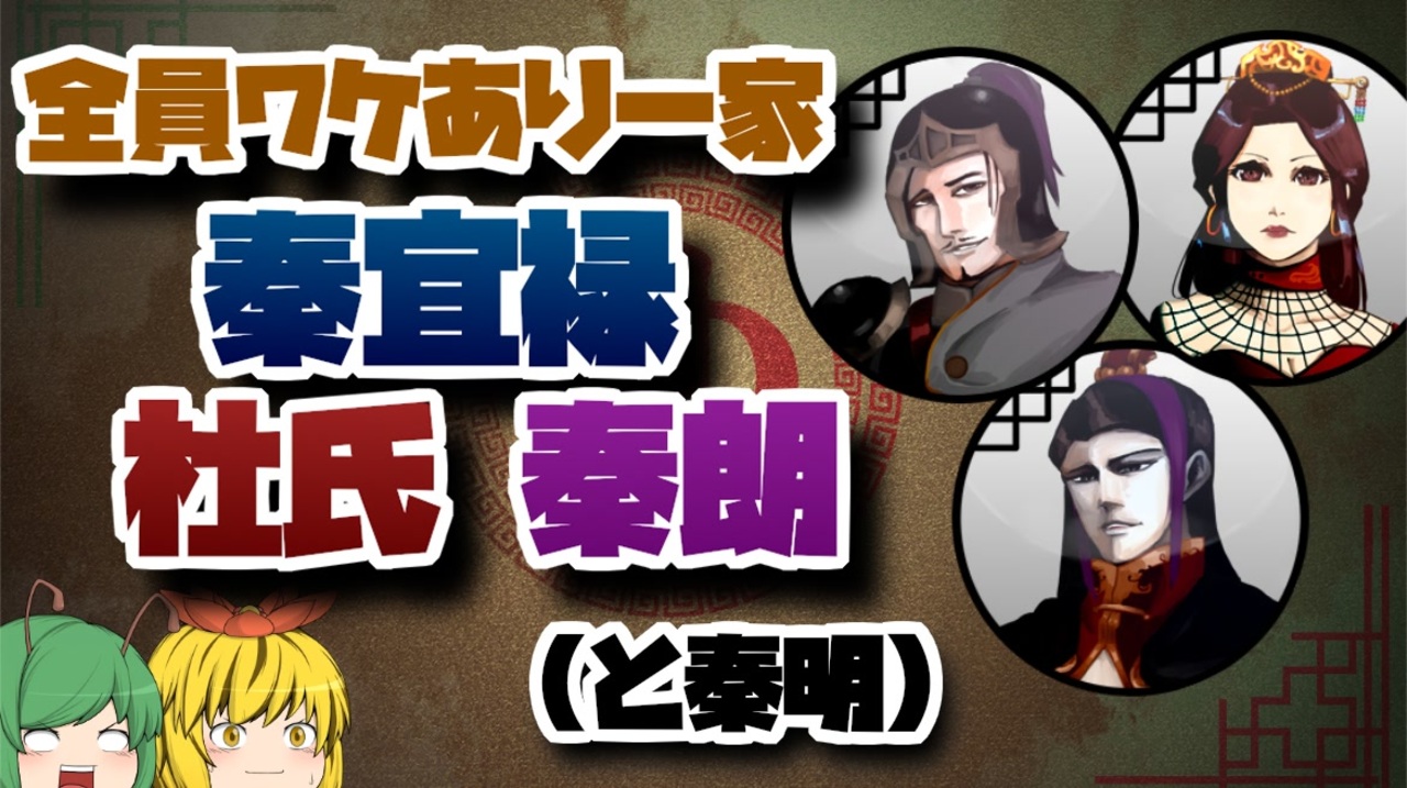 この動画は東方projectの二次創作です。AquesTalkライセンス購入済み。<br><br>◇反三国志二次創作同人誌「叔漢二國史」<br>冊子版 <a href="https://onl.sc/tKwXmmJ" target="_blank" rel="noopener nofollow">https://onl.sc/tKwXmmJ</a><br>電子書籍版 <a href="https://onl.sc/HAJFhCp" target="_blank" rel="noopener nofollow">https://onl.sc/HAJFhCp</a><br><br>三国志のメジャーではないけれど面白い人物や評価されるべき人物を紹介していきます。<br>「呂布の配下」と聞いて、思い浮かべる人物といえば誰でしょうか。<br>今回はその中から一人、美人の奥さんを持ちながら、権力者に翻弄され、やがて理不尽に滅ぼされた秦宜禄について、またその奥さんであり、魏の夫人として栄達を極めた杜氏、そして彼らの子であり、一時は国内の権力をほしいままにしながらも、哀れに散った秦朗について解説していきます。<br>彼ら一家はそれぞれ、一見するとどこか欠点ばかり抱えて良そうにも見えるのですが、その実態を考察すると、とても面白い一面が見えてくるのであります。<br><br>▷第五十二回「陸胤」<a href="https://www.nicovideo.jp/watch/sm41195425" class="watch">sm41195425</a><br>▷第五十四回「秦秀」<a href="https://www.nicovideo.jp/watch/sm41575453" class="watch">sm41575453</a><br><br>◆◆◆◆◆◆◆◆◆◆◆◆◆◆◆◆◆◆◆◆◆◆◆<br>参考文献、補足など<br>亶夏王朝府 <a href="https://danxiawangchao.hatenablog.com/" target="_blank" rel="noopener nofollow">https://danxiawangchao.hatenablog.com/</a><br>この動画の参考文献 <a href="https://danxiawangchao.hatenablog.com/entry/2022/11/15/230657" target="_blank" rel="noopener nofollow">https://danxiawangchao.hatenablog.com/entry/2022/11/15/230657</a><br><br>この動画のイラストまとめ<br>Pixiv <a href="https://www.pixiv.net/artworks/102851967" target="_blank" rel="noopener nofollow">https://www.pixiv.net/artworks/102851967</a><br>ニコニコ静画 <a href="https://seiga.nicovideo.jp/seiga/im11074170" target="_blank" rel="noopener">im11074170</a><br>BOOTH <a href="https://danxiawangchao.booth.pm/items/4324042" target="_blank" rel="noopener nofollow">https://danxiawangchao.booth.pm/items/4324042</a><br><br>YouTubeにもアップロードしています。よろしければ評価、チャンネル登録よろしくお願いします。<br><a href="https://youtu.be/8Z_zadeN714" target="_blank" rel="noopener nofollow">https://youtu.be/8Z_zadeN714</a><br>◆◆◆◆◆◆◆◆◆◆◆◆◆◆◆◆◆◆◆◆◆◆◆<br><br>音楽効果音提供<br>チンドン演歌/稿屋 隆 様<br>Motion/shimtone 様<br>乱桜舞弾幕/keisuke 様<br>オデュッセイア/甘茶の音楽工房<br>Flying Force Combat/清水 裕介 様<br>鋼炎/REV 様<br>効果音提供/効果音ラボ 様<br>