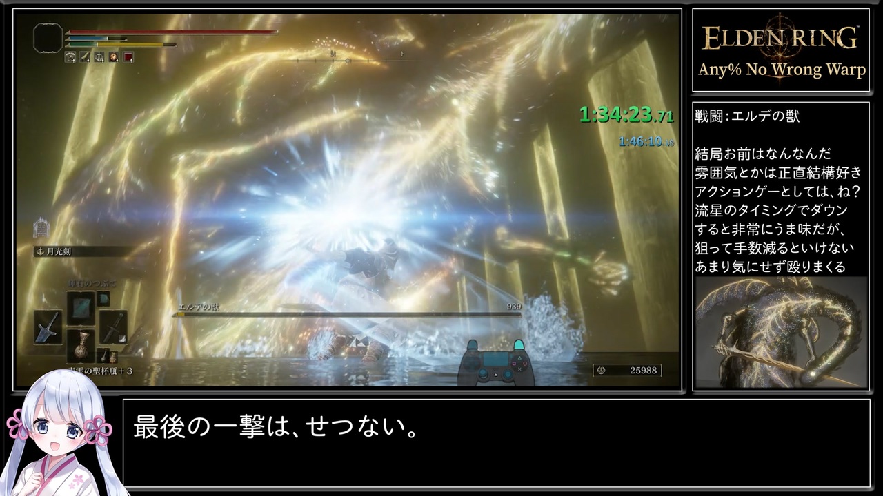 暗き路を行くので初投稿です。<br><br>■カテゴリ|Any% No Wrong Warp<br>・Wrong Warp / Pegasus Glitchは禁止<br>・メイン武器は暗月の大剣を使用<br>・なんでもいいから速くクリアする<br>・IGT計測 (RTも同時計測。こちらの記録は1時間46分32秒)<br><br>元配信|<a href="https://www.twitch.tv/videos/1646157293" target="_blank" rel="noopener nofollow">https://www.twitch.tv/videos/1646157293</a><br>Youtube版|<a href="https://youtu.be/o1bP5dLRyag" target="_blank" rel="noopener nofollow">https://youtu.be/o1bP5dLRyag</a><br><br>前回|<a href="https://www.nicovideo.jp/watch/sm41379446" class="watch">sm41379446</a><br>次回|<a href="https://www.nicovideo.jp/watch/sm41379896" class="watch">sm41379896</a><br><br>■Twitch<br><a href="https://www.twitch.tv/mizukiaihara" target="_blank" rel="noopener nofollow">https://www.twitch.tv/mizukiaihara</a><br>■YouTube<br><a href="https://www.youtube.com/channel/UCZA7VfDPNNPoxGDdoa4dxUg/" target="_blank" rel="noopener nofollow">https://www.youtube.com/channel/UCZA7VfDPNNPoxGDdoa4dxUg/</a><br>■Twitter<br><a href="https://twitter.com/mizuki_aihr" target="_blank" rel="noopener nofollow">https://twitter.com/mizuki_aihr</a><br><br>RTAとかゲーム関連|<a href="https://www.nicovideo.jp/series/280760" target="_blank" rel="noopener">series/280760</a><br>オリジナル曲とか音楽関連|<a href="https://www.nicovideo.jp/series/142252" target="_blank" rel="noopener">series/142252</a><br><br>解説音声:つくよみちゃん(COEIROINK)<br>イラスト素材:えみゃコーラ様|<a href="https://seiga.nicovideo.jp/seiga/im10760810" target="_blank" rel="noopener">im10760810</a><br>フリー素材キャラクターつくよみちゃん|<a href="https://tyc.rei-yumesaki.net/" target="_blank" rel="noopener nofollow">https://tyc.rei-yumesaki.net/</a>