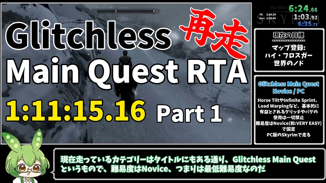 <span style="color: #ff9900; font-size: 18px;"><strong>現世界記録の解説動画→</strong></span><span style="color: #4a86e8; font-size: 18px;"><strong><a href="https://www.nicovideo.jp/watch/sm42107712" class="watch">sm42107712</a></strong></span><br><br><strong>カテゴリー</strong><br>Glitchless Main Quest / Novice / PC<br><br><strong>主なルール</strong><br>・グリッチの使用禁止 (Horse TiltingやInfinite Sprint、Load Warpingなど全部)<br>・メインクエスト「外交特権」進行中以外でサルモール大使館に侵入、ムザークの塔に出口から侵入など、意図しない方法によるアクセス禁止 <br>詳細 ↓<br>・<a href="https://www.speedrun.com/skyrim/full_game?h=Glitchless_Main_Quest-Novice-PC&rules=category&x=9kvpvekg-0nwpkvr8.0q5m3wvl-7891rq9n.rqv09g6l" target="_blank" rel="noopener nofollow">https://www.speedrun.com/skyrim/full_game?h=Glitchless_Main_Quest-Novice-PC&rules=category&x=9kvpvekg-0nwpkvr8.0q5m3wvl-7891rq9n.rqv09g6l</a><br>・<a href="https://www.speedrun.com/skyrim/guide/xjli0" target="_blank" rel="noopener nofollow">https://www.speedrun.com/skyrim/guide/xjli0</a><br><br><strong>記録詳細</strong><br>IGT - 1:08:25.813<br>RTA - 1:11:15.164<br><a href="https://www.speedrun.com/skyrim/run/yv0dgqez" target="_blank" rel="noopener nofollow">https://www.speedrun.com/skyrim/run/yv0dgqez</a><br><br>次回: 無し。<br><br><strong>Credits</strong><br>VOICEVOX: ずんだもん<br>立ち絵素材: のんたお 様 (<a href="https://www.nicovideo.jp/user/121937664" target="_blank" rel="noopener">user/121937664</a>)<br><br><br>■Twitch<br><a href="https://www.twitch.tv/lithium_l_" target="_blank" rel="noopener nofollow">https://www.twitch.tv/lithium_l_</a><br>■Twitter<br><a href="https://twitter.com/Lithium_L_" target="_blank" rel="noopener nofollow">https://twitter.com/Lithium_L_</a><br>■SRC<br><a href="https://www.speedrun.com/user/Lithium_L" target="_blank" rel="noopener nofollow">https://www.speedrun.com/user/Lithium_L</a>