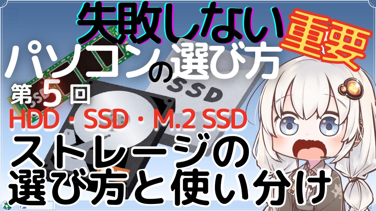 この動画のブログ<br><a href="https://da-san.work/how-to-choose-computer-05/" target="_blank" rel="noopener nofollow">https://da-san.work/how-to-choose-computer-05/</a><br><br>GigazinさんのSSD耐久テスト記事<br><a href="https://gigazine.net/news/20150316-ssd-endurance-experiment-4th/" target="_blank" rel="noopener nofollow">https://gigazine.net/news/20150316-ssd-endurance-experiment-4th/</a><br><br>ファイル管理について書いた記事<br><a href="https://da-san.work/desktop-clean-up/" target="_blank" rel="noopener nofollow">https://da-san.work/desktop-clean-up/</a><br><br>ろむてるのパソコン解説マイリスト<br><a href="https://www.nicovideo.jp/mylist/73674594" target="_blank" rel="noopener">mylist/73674594</a><br><br />ろむてるの各シリーズの動画マイリスト<br><a href="https://www.nicovideo.jp/mylist/72336572" target="_blank" rel="noopener">mylist/72336572</a><br><br>ろむてるYoutubeチャンネル↓<br><a href="https://www.youtube.com/channel/UCAj8wqPqMZdAxpURAT_rSxg" target="_blank" rel="noopener nofollow">https://www.youtube.com/channel/UCAj8wqPqMZdAxpURAT_rSxg</a><br><br>Twitter本アカ - <a href="https://twitter.com/Da_project" target="_blank" rel="noopener nofollow">https://twitter.com/Da_project</a><br>Bluesky - <a href="https://bsky.app/profile/da-romtell.com" target="_blank" rel="noopener nofollow">https://bsky.app/profile/da-romtell.com</a><br>ブログ - <a href="https://da-romtell.com/" target="_blank" rel="noopener nofollow">https://da-romtell.com/</a>