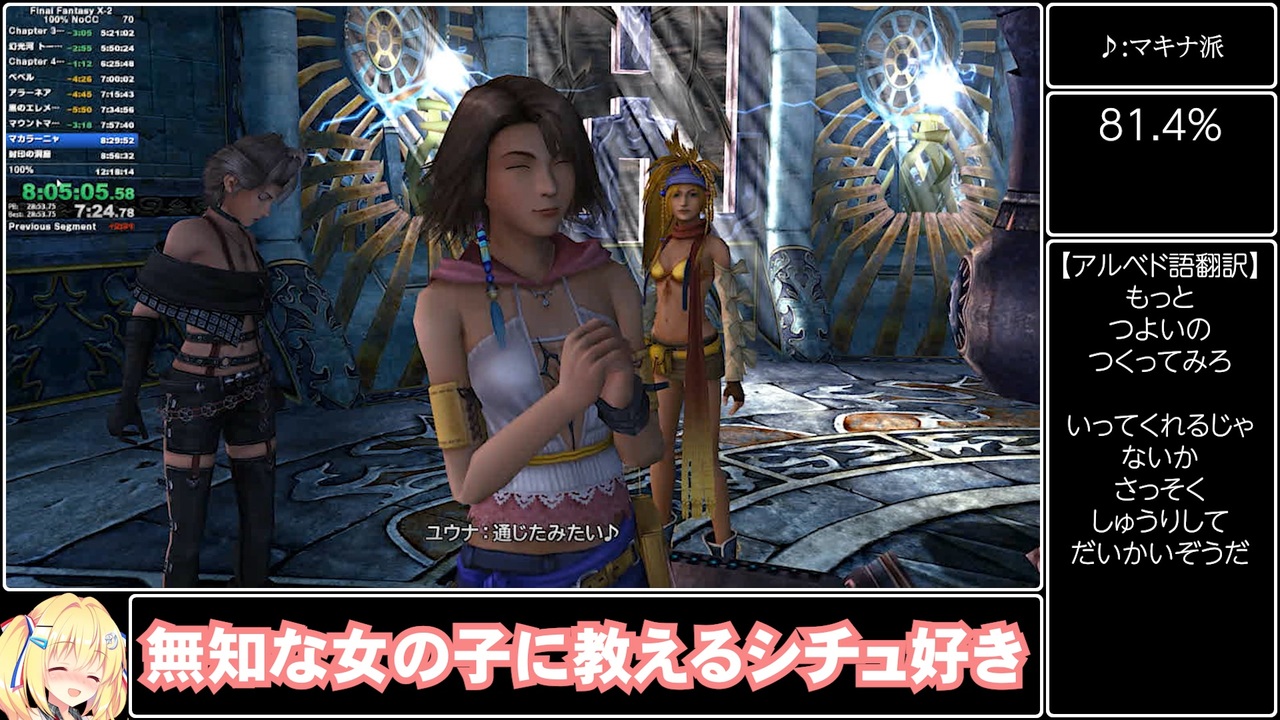 不老不死ってゆうてほしいか?ひたすら送る側なのはつらいよね<br><br>【ゲーム概要】<br>・FINAL FANTASY X-2 (ファイナルファンタジー10-2)<br>・PC版 Steam<br>・100%<br>・No Creature Creator (クリーチャークリエイト禁止)<br>・計測区間:New Game選択~終了画面100%表示<br>・セーブ機能使用<br>・バグ技禁止<br>・チートコマンド禁止 (倍速機能など)<br><br>【リンク】<br>Part1:<a href="https://www.nicovideo.jp/watch/sm40776052" target="_blank" rel="noopener nofollow">https://www.nicovideo.jp/watch/sm40776052</a><br><br>マイリスト:<a href="https://www.nicovideo.jp/mylist/73452210" target="_blank" rel="noopener nofollow">https://www.nicovideo.jp/mylist/73452210</a><br><br>YouTube:<a href="https://youtu.be/dpxQwzwMbl8" target="_blank" rel="noopener nofollow">https://youtu.be/dpxQwzwMbl8</a><br><br>未編集ノーカーット超大作:<a href="https://youtu.be/xeSsCrFZYeg" target="_blank" rel="noopener nofollow">https://youtu.be/xeSsCrFZYeg</a><br><br>Twitter:<a href="https://twitter.com/lunearcenciel" target="_blank" rel="noopener nofollow">https://twitter.com/lunearcenciel</a><br><br>Copyright (C) 2001, 2003, 2019 SQUARE ENIX CO., LTD. All Rights Reserved.