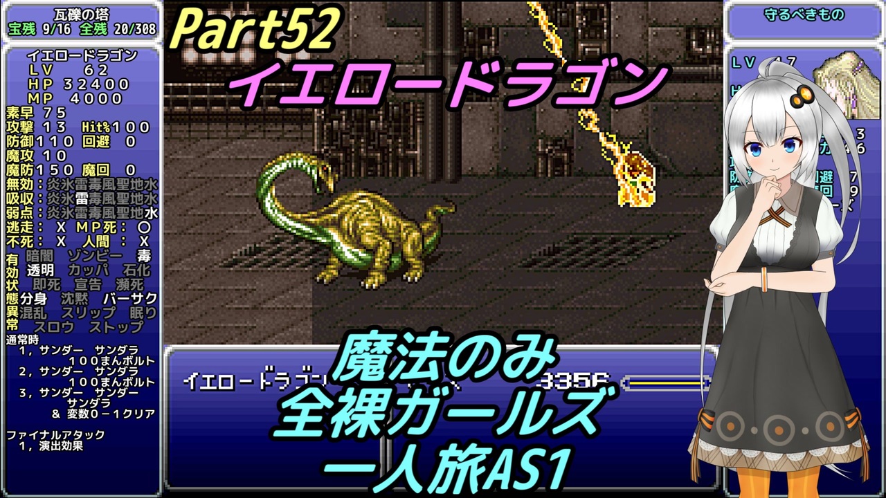 戦隊モノから考えてもイエローはネタ枠だと思うのです。<br><br>・次回 … Part53 <a href="https://www.nicovideo.jp/watch/sm41514182" class="watch">sm41514182</a><br>・前回 … Part51 <a href="https://www.nicovideo.jp/watch/sm41235820" class="watch">sm41235820</a><br><br>・Youtube版 … <a href="https://youtu.be/7RTldJUnMjU" target="_blank" rel="noopener nofollow">https://youtu.be/7RTldJUnMjU</a><br>・字幕のみ … <a href="https://youtu.be/zAWV1AkIt8o" target="_blank" rel="noopener nofollow">https://youtu.be/zAWV1AkIt8o</a><br><br>【縛り内容】<br>1、魔法のみ<br>2、全裸(魔石はあり)<br>3、ガールズ<br>4、一人旅<br>5、アクティブ バトルスピード1 メッセージスピード1 詳細:<a href="https://www.nicovideo.jp/watch/sm34595412" class="watch">sm34595412</a><br>6、逃げられない!!表示の連射禁止<br>7、ボスの即死は禁止<br>8、宝物は全て集める<br>9、不具合やバグは不可<br>10、可能な限り低レベル<br>11、コマンド短縮やカーソル記憶しない<br>12、セーブ可能な場所でのみアイテム可<br>13、一部ストーリー上の編成でやむを得ない場合は最低限<br /><br>ふよふよしているの<br>絵:横沢さわらさん VOICEVOX:WhiteCUL<br><br>【シリーズ】<br>くうねるきゃんぷ … <a href="https://www.nicovideo.jp/series/516069" target="_blank" rel="noopener">series/516069</a><br>お写んぽ! … <a href="https://www.nicovideo.jp/series/435756" target="_blank" rel="noopener">series/435756</a><br>様子がおかしい! … <a href="https://www.nicovideo.jp/series/418875" target="_blank" rel="noopener">series/418875</a><br>FF7 魔法マテリアのみ初期防具ガールズ一人旅ASM … <a href="https://www.nicovideo.jp/series/438696" target="_blank" rel="noopener">series/438696</a><br>きんかつ!V-STROM1050XT … <a href="https://www.nicovideo.jp/series/144466" target="_blank" rel="noopener">series/144466</a><br>FF6 魔法のみ全裸ガールズ一人旅AS1 … <a href="https://www.nicovideo.jp/series/9438" target="_blank" rel="noopener">series/9438</a><br>おバイク!GLADIUS400 ABS … <a href="https://www.nicovideo.jp/series/68579" target="_blank" rel="noopener">series/68579</a><br>FF5 魔法のみ全裸一人旅AS1 … <a href="https://www.nicovideo.jp/series/9432" target="_blank" rel="noopener">series/9432</a><br>DQ3 呪文のみ全裸一人旅 … <a href="https://www.nicovideo.jp/series/9416" target="_blank" rel="noopener">series/9416</a><br>DQ2 ムーンブルクの王女一人旅 … <a href="https://www.nicovideo.jp/series/9414" target="_blank" rel="noopener">series/9414</a><br>DQ1 全裸 … <a href="https://www.nicovideo.jp/series/9412" target="_blank" rel="noopener">series/9412</a><br>FE 紋章の謎 天馬騎士単騎 第2部 英雄戦争 … <a href="https://www.nicovideo.jp/series/9404" target="_blank" rel="noopener">series/9404</a><br>FE 紋章の謎 天馬騎士単騎 第1部 暗黒戦争 … <a href="https://www.nicovideo.jp/series/9401" target="_blank" rel="noopener">series/9401</a><br>聖剣2 全裸プリム一人旅 武器Lv1など … <a href="https://www.nicovideo.jp/series/9396" target="_blank" rel="noopener">series/9396</a><br>ロマサガ2 魔術士不得意武器のみ … <a href="https://www.nicovideo.jp/series/9388" target="_blank" rel="noopener">series/9388</a><br>ロマサガ1 術法のみ一人旅で各イベント攻略 … <a href="https://www.nicovideo.jp/series/9386" target="_blank" rel="noopener">series/9386</a><br><br>SNSとか色々なリンク … <a href="https://lit.link/Unaa" target="_blank" rel="noopener nofollow">https://lit.link/Unaa</a>