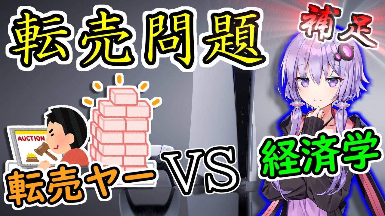 『【リメイク】経済学で考えるPS5転売問題』の補足動画です。<br>PS5転売問題(本編)→<a href="https://www.nicovideo.jp/watch/sm40312282" class="watch">sm40312282</a><br>プロスペクト理論→<a href="https://www.nicovideo.jp/watch/sm38032460" class="watch">sm38032460</a><br><br>【引用文献】<br>Alan B. Krueger(2001) “Supply and Demand: An Economist Goes to Superbowl,” The Mikken Institute Review, Second Quarter, pp.22-29.<br>Edward Cartwright (2018) “Behavioral Economics Third Edition” Routledge.<br>Yeon-Koo Che, Ian Gale, and Jinwoo Kim(2013) “Assigning Resources to Budget-Constrained Agents.” Review of Economics Studies, 80, pp.73-107.<br>大竹文雄(2017)『競争社会の歩き方』中公新書。<br>奥野正寛(2008)『ミクロ経済学』東京大学出版会。<br>神取道宏(2014)『ミクロ経済学の力』日本評論社。<br>【使用ソフト・使用素材】<br>AviUtl(<a href="http://spring-fragrance.mints.ne.jp/aviutl/" target="_blank" rel="noopener nofollow">http://spring-fragrance.mints.ne.jp/aviutl/</a> )<br>VoiceroidUtil(<a href="https://ruche-home.net/download#voiceroid-util" target="_blank" rel="noopener nofollow">https://ruche-home.net/download#voiceroid-util</a> )<br>声:結月ゆかり,紲星あかり(<a href="https://www.ah-soft.com/voiceroid/" target="_blank" rel="noopener nofollow">https://www.ah-soft.com/voiceroid/</a> )<br>キャラクター素材:コンテンツツリー参照(<a href="https://commons.nicovideo.jp/tree/parents/sm41405624" target="_blank" rel="noopener nofollow">https://commons.nicovideo.jp/tree/parents/sm41405624</a> )<br>イラスト:いらすとや(<a href="https://www.irasutoya.com/" target="_blank" rel="noopener nofollow">https://www.irasutoya.com/</a> )<br>吹き出し:フキダシデザイン(<a href="https://fukidesign.com/" target="_blank" rel="noopener nofollow">https://fukidesign.com/</a> )<br>イラスト:フリー素材あそび(<a href="https://free-stock.design-asobi.net/" target="_blank" rel="noopener nofollow">https://free-stock.design-asobi.net/</a> )<br>BGM:フリーBGM・音楽素材MusMus(<a href="http://musmus.main.jp/" target="_blank" rel="noopener nofollow">http://musmus.main.jp/</a> )<br>BGM:魔王魂(<a href="https://maoudamashii.jokersounds.com/ )" target="_blank" rel="noopener nofollow">https://maoudamashii.jokersounds.com/ )</a><br>BGM:Sound Bound(<a href="https://soundbound.net/" target="_blank" rel="noopener nofollow">https://soundbound.net/</a> )<br>効果音:効果音ラボ(<a href="https://soundeffect-lab.info/" target="_blank" rel="noopener nofollow">https://soundeffect-lab.info/</a> )