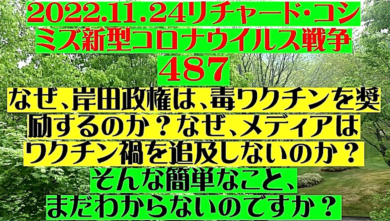 <span style="color: #cc4125;"><strong>「 テーマ:新型コロナウイルス戦争 487 」</strong></span><br><br><span style="color: #ff0000;"><strong>「 なぜ、『 岸田文雄政権 』は、『 毒ワクチンを奨励 』するのか?なぜ、『 メディア 』は、<br> 『 ワクチン禍を追及しない 』のか?そんな簡単なこと、まだ分からないのですか? 」</strong></span><br><br><span style="color: #0000ff;"><strong>「『 イベルメクチン・アビガン・その他コロナ対策 』についてのご意見をお寄せ下さい! 」</strong></span><br><br> <strong>◐ E-mail:richardkoshimizu@gmail.com<br><br>*「クリエイターサポート」・「フォロー」・「ニコニ広告」等、是非ご協力下さい。 リチャード・コシミズ</strong><br><br><span style="color: #38761d;"><strong>◐リチャード・コシミズ 公式 ブログ</strong></span><br> <a href="https://richard-koshimizu.jimdosite.com/" target="_blank" rel="noopener nofollow">https://richard-koshimizu.jimdosite.com/</a><br><br><span style="color: #38761d;"><strong>◐リチャード・コシミズ 公式 ホームページ<br> </strong></span><a href="http://richardkoshimizu.boo.jp/" target="_blank" rel="noopener nofollow">http://richardkoshimizu.boo.jp/</a><br><br><span style="color: #38761d;"><strong>◐リチャード・コシミズ オンライン ショップ</strong></span><br> <a href="https://rkonline.shop-pro.jp/" target="_blank" rel="noopener nofollow">https://rkonline.shop-pro.jp/</a><br><br><span style="color: #38761d;"><strong>◐リチャード・コシミズ 講演会 公式 動画ギャラリー</strong></span><br> <a href="http://www.t-sskk.com/richardkoshimizu/video-gallery/index.html" target="_blank" rel="noopener nofollow">http://www.t-sskk.com/richardkoshimizu/video-gallery/index.html</a><br>