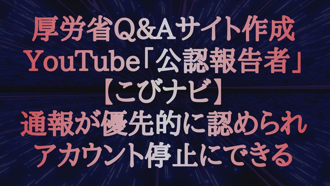 こびナビは、YouTubeの「公認報告者」で、ワクチンに関するご情報を広めるアカウントを優先的に報告でき、アカウントを停止にできる、と。こわいよー。<br>この情報は可能な限り大拡散を希望します。<br> こびナビが普通の団体でないことは、この インファクト の記事から明らかです。<br>この記事は、田島輔さんという弁護士の資格をもったファクトチェッカーの方が書かれており、根拠も示されています。<br> 今回のこびナビの暗躍については、今すぐにでも追及解明されるべきです。<br>こびナビとYouTubeやTwitter社との関係についても、かなり疑いは持っていました。<br> そちらも、もちろん大問題だと思いますが、その前にまずこちらの「大元からです。<br><br>こびナビはインファクトの質問に<br> 「厚生労働省とは、コロナワクチンに関する、正確な情報を市民に提供するという目的達成のため、協働関係にある」と答えたそうです。<br>なぜ単なる任意団体のこびナビが、国の機関である厚労省とそのような関係になれるのか、意味がわかりません。<br> これでは統一教会と同じではありませんか。<br>何らかの意思・目的を持った民間団体が、公式の資格も無しに、国のやることに好き勝手に口を挟むなんて許されますか? <br> 誰の許しを得てやっているのか、明確にするべきです。<br>国政の私物化、乗っ取りに他なりませんよね。<br> この問題、国会で徹底的に追及してほしいと思います。<br>この問題は徹底追求すべきですね。<br> そもそも○価がワクチン関連のフロント。<br> 彼らはそのバックがあるのであの様な強気の発信を繰り返しているんです。<br> 統一教会と全く同じ構図です。<br><br>こびナビについてインファクトの検証記事。<br> 厚労省と密接な関係をもち、厚労省Q&Aサイト作成にも関与。<br> YouTubeの公認報告者として、誤情報の通報が優先的に認められていたという<br> (その報告で動画削除に繋がった可能性)。<br>「独裁者」のやり方ですよね…自分達の意見や意志だけを「正解」として流せるとしたら、やりたい放題できますもんね。怖いなぁ□<br>YouTube(Google)って日本にこんな権限与えてるんだ。<br> 規約とかアメリカとは違うのか⁉️ これまでアメリカ基準の言論統制って思ってたけど、日本独自なら既に中国以上の共産国家になってないか⁉️□□<br>❶<a href="https://x.gd/dvhih" target="_blank" rel="noopener nofollow">https://x.gd/dvhih</a><br>❷<a href="https://x.gd/1ODVI" target="_blank" rel="noopener nofollow">https://x.gd/1ODVI</a><br>記事 <a href="https://x.gd/yJcRJ" target="_blank" rel="noopener nofollow">https://x.gd/yJcRJ</a><br>❸<a href="https://x.gd/cs2c3" target="_blank" rel="noopener nofollow">https://x.gd/cs2c3</a><br>❹<a href="https://x.gd/kT21W" target="_blank" rel="noopener nofollow">https://x.gd/kT21W</a><br>❺<a href="https://x.gd/1bQZB" target="_blank" rel="noopener nofollow">https://x.gd/1bQZB</a><br><br />著作権、肖像権に配慮して作成しております。<br><br>◆気になったニュースの台本!?<br>メモ代わりに作った台本をそのままあげてます<br><a href="https://keiichiro8140.hatenablog.com/." target="_blank" rel="noopener nofollow">https://keiichiro8140.hatenablog.com/.</a><br><br><br>ここからはシリーズ紹介<br><br><br>◆ ワクチン解毒・デトックス<br><a href="https://x.gd/fZweg" target="_blank" rel="noopener nofollow">https://x.gd/fZweg</a><br><br>◆ウイリアム・マキス博士のがん治療(イベルメクチン・フェンベンダゾール等)<br><a href="https://x.gd/AtFYS" target="_blank" rel="noopener nofollow">https://x.gd/AtFYS</a><br><br>◆予防接種健康被害救済制度<br><a href="https://x.gd/0xK9x" target="_blank" rel="noopener nofollow">https://x.gd/0xK9x</a><br><br>◆気になったニュース #1501~<br><br>◆ 【ショートver】気になったニュース<br><a href="https://x.gd/7MxXC" target="_blank" rel="noopener nofollow">https://x.gd/7MxXC</a><br><br>◆ 気になったニュース #1001~<br><a href="https://x.gd/Lp8gv" target="_blank" rel="noopener nofollow">https://x.gd/Lp8gv</a><br><br>◆ 気になったニュース #501~<br><a href="https://x.gd/EmbS4" target="_blank" rel="noopener nofollow">https://x.gd/EmbS4</a><br><br>◆ 気になったニュース #1~#500<br><a href="https://x.gd/uPhNb" target="_blank" rel="noopener nofollow">https://x.gd/uPhNb</a><br><br>◆ X(旧Twitter)・テレグラムで気になった情報<br><a href="https://x.gd/YG6FT" target="_blank" rel="noopener nofollow">https://x.gd/YG6FT</a><br><br>◆ 日比谷5万人パレードデ⚪生放送アーカイブ動画<br><a href="https://x.gd/3CHJv" target="_blank" rel="noopener nofollow">https://x.gd/3CHJv</a><br><br>◆日比谷5万人パレード⚪モのマイリスト作ってみました<br><a href="https://nico.ms/mylist/76828848?ref=sp_other" target="_blank" rel="noopener nofollow">https://nico.ms/mylist/76828848?ref=sp_other</a><br><br>◆3.30 令和の百姓⚪⚪<br><a href="https://www.nicovideo.jp/series/511791?ref=garage_share_other" target="_blank" rel="noopener nofollow">https://www.nicovideo.jp/series/511791?ref=garage_share_other</a><br><br>◆ 及川幸久さんの【XNEWS】シリーズ<br><a href="https://x.gd/3k78K" target="_blank" rel="noopener nofollow">https://x.gd/3k78K</a><br><br>◆これまでの動画<a href="https://x.gd/sPXoJ" target="_blank" rel="noopener nofollow">https://x.gd/sPXoJ</a><br><br>◆もしも(BAN)の時のためのマイリンク