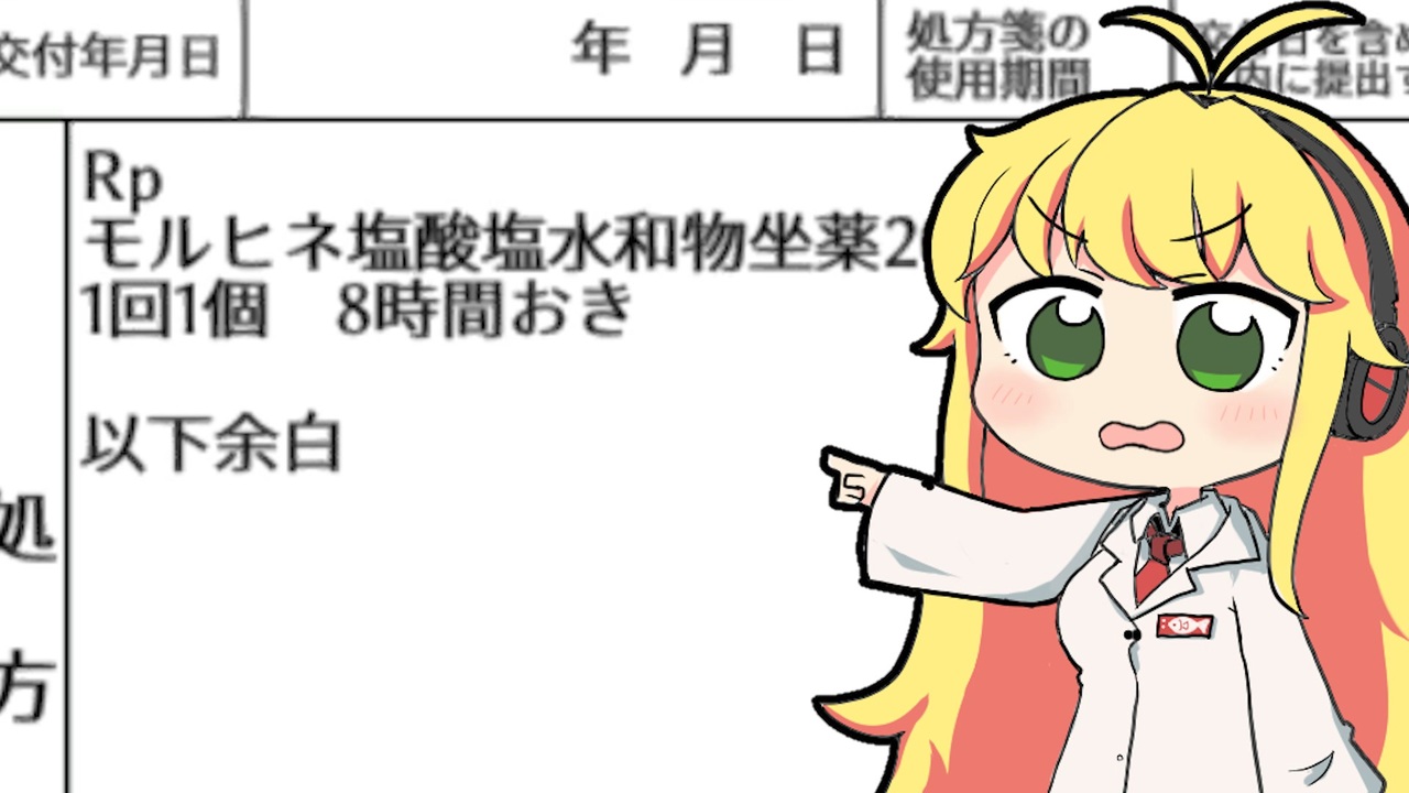 処方箋について疑わしい点があった時に薬剤師が処方医に問い合わせる、「疑義照会」をテーマにしたゲーム、「疑義照会ウォーズ」で遊びながら、登場する医薬品について解説していく動画です。<br><br>どちらかというと解説メインの動画なので、「解説・講座」ジャンルで投稿します。<br><br><span style="color: #0000ff; font-size: 16px;"><strong>いいねをするとプチお薬解説が見れるぞ!</strong></span><br><br>プレイは生放送でやりました。アーカイブはこちら。<br><a href="https://www.youtube.com/watch?v=0txQa2U6r0o&t=3984s" target="_blank" rel="noopener nofollow">https://www.youtube.com/watch?v=0txQa2U6r0o&t=3984s</a><br><br><span style="font-size: 13px;">Youtube: <a href="https://www.youtube.com/channel/UCcLWyYVS3ysazvYjN7pKXuw" target="_blank" rel="noopener nofollow">https://www.youtube.com/channel/UCcLWyYVS3ysazvYjN7pKXuw</a> </span><br><span style="color: #262626;">Twitter: <a href="https://twitter.com/Iwashi_bibili" target="_blank" rel="noopener nofollow">https://twitter.com/Iwashi_bibili</a> <br><br>使用ソフト<br>Premiere Pro<br>After Effects<br>VOICEROID2<br>VoiceroidUtil<br>2dActorTools</span><br><br> ================薬剤師マキの挑む薬剤師シミュレーター==================<br><span style="color: #0000ff; font-size: 13px;">マキ立ち絵:えびごはん 様( <a href="https://twitter.com/ebi_gohan" target="_blank" rel="noopener nofollow">https://twitter.com/ebi_gohan</a> ) <<オリジナル立ち絵のため配布しておりません>></span><span style="color: #0000ff;"> </span><br>ゲーム: 疑義照会ウォーズ(Steam <a href="https://store.steampowered.com/app/1799080/_/)" target="_blank" rel="noopener nofollow">https://store.steampowered.com/app/1799080/_/)</a>