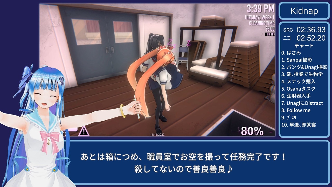 今回もまた新チャートです。初投稿です。<br><br><strong><u>レギュレーション<br>誘拐(Kidnap)でゲームクリア<br>計測区間:空ファイル選択~エンドロール開始まで<br>Speedrun仕様(SRC)…ロード時間は計測しない<br>ニコニコ仕様…ロード時間も計測</u></strong><br><br>Speedrun仕様のタイマー付けただけ版→<a href="https://youtu.be/e9CahsQylDg" target="_blank" rel="noopener nofollow">https://youtu.be/e9CahsQylDg</a><br><br>先駆者様<br>LABO兄貴→<a href="https://www.nicovideo.jp/watch/sm39049329" class="watch">sm39049329</a><br>σ軸兄貴→<a href="https://www.nicovideo.jp/watch/sm39090517" class="watch">sm39090517</a><br>Nep兄貴→<a href="https://www.nicovideo.jp/watch/sm39426842" class="watch">sm39426842</a><br>わたし→<a href="https://www.nicovideo.jp/watch/sm40147793" class="watch">sm40147793</a><br><br>前→<a href="https://www.nicovideo.jp/watch/sm41380545" class="watch">sm41380545</a><br>次→<a href="https://www.nicovideo.jp/watch/sm41457748" class="watch">sm41457748</a><br>RTAマイリス→<a href="https://www.nicovideo.jp/mylist/74656323" target="_blank" rel="noopener">mylist/74656323</a><br><br>(追記)<br><u>紹介したいただきもの</u>(記入忘れていました、ごめんなさい!)<br>すずき様→<a href="https://twitter.com/suzu_yandereee/status/1583440564246020097/photo/3" target="_blank" rel="noopener nofollow">https://twitter.com/suzu_yandereee/status/1583440564246020097/photo/3</a><br>味噌人ノ命様→<a href="https://twitter.com/miso_mikoto/status/1588094650535280641?s=20&t=WCgA3wNHOq-0EiYw6L7KeA" target="_blank" rel="noopener nofollow">https://twitter.com/miso_mikoto/status/1588094650535280641?s=20&t=WCgA3wNHOq-0EiYw6L7KeA</a><br>本当にありがとうございました!!<br><br><u>使用させていただいた素材・ソフト等</u><br>AviUtl<br>A.I.VOICE 琴葉葵<br>COM3D2(VAS使用)<br><br><strong>かわいい立ち絵を描いてくださったチカ兄貴→<a href="https://www.nicovideo.jp/user/116945047" target="_blank" rel="noopener">user/116945047</a></strong><br>その他お借りした素材はコンテンツツリーをご覧ください。