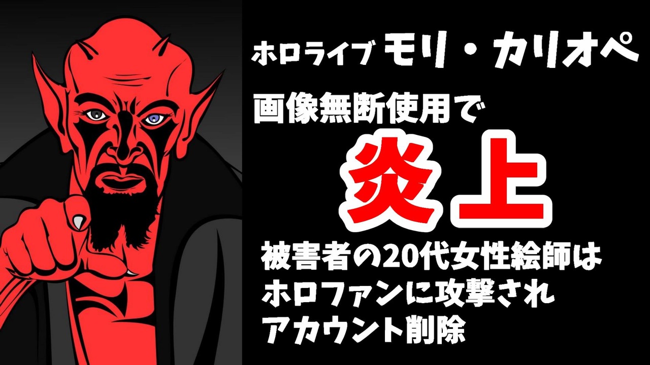 2022年11月26日、カバー株式会社が運営するホロライブプロダクションのホロライブEnglishに所属するモリ・カリオペがイラストをサムネイルに無断使用したとして炎上しています。被害になったイラストレーターはホロライブファンに攻撃されたためか一度ツイッターアカウントを鍵垢にし、その後削除されました。<br><br>引用<br><a href="https://www.pixiv.net/artworks/98819823" target="_blank" rel="noopener nofollow">https://www.pixiv.net/artworks/98819823</a><br><br>Youtube <a href="https://www.youtube.com/channel/UCzYQPx8MeE99DUkW9Y_txJw" target="_blank" rel="noopener nofollow">https://www.youtube.com/channel/UCzYQPx8MeE99DUkW9Y_txJw</a><br>twitter <a href="https://twitter.com/V_Virgin_Mary" target="_blank" rel="noopener nofollow">https://twitter.com/V_Virgin_Mary</a><br><br>使用素材<br>高品質なフリー動画素材 - Pixabay <a href="https://pixabay.com/ja/videos" target="_blank" rel="noopener nofollow">https://pixabay.com/ja/videos</a>