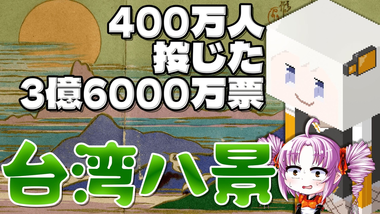 昭和2年、1927年4月に大阪毎日新聞社と東京日日新聞社が主催した名勝地人気投票、「日本新八景」が大人気を博した。当時の日本人口は約6,000万人に対し、9,300万通の投票ハガキを募った。そして一ヶ月後、当時まだ日本統治時代の台湾でも「台湾八景」人気投票の開催が予告された。一ヶ月に渡る投票期間中、3億6,000万通の投票ハガキを募った。当時の台湾総人口は約400万人ぐらいしかないので、平均一人は90通のハガキを送ったとの計算になった。<br><br>●動画リンク:<br>Youtube→<a href="https://www.youtube.com/watch?v=1GFxNLRAScY" target="_blank" rel="noopener nofollow">https://www.youtube.com/watch?v=1GFxNLRAScY</a><br>Niconico→<a href="https://www.nicovideo.jp/watch/sm41435997" target="_blank" rel="noopener nofollow">https://www.nicovideo.jp/watch/sm41435997</a><br> <br>●立ち絵、挿し絵:<br>SD役ついな(しのびぃ~さん)<br>國立台灣大學圖書館<br><br>●音楽、効果音:<br>Temptation(Chris Haugenさん)<br><br><span style="font-size: 10px;">●検索用タグ:台湾、日本統治時代、台湾日日新報、台湾八景、日本新八景、人気投票、総選挙</span><br><br>|ボロボロ日本語シリーズ|<br><i><a href="https://www.nicovideo.jp/mylist/69207343" target="_blank" rel="noopener">mylist/69207343</a></i>