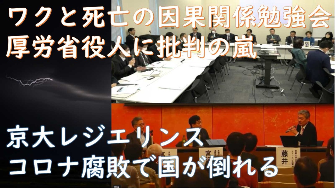 令和4年11月25日新型コロナワクチン接種と死亡事例の因果関係を考える勉強会<br><a href="https://www.nicovideo.jp/watch/sm41420798" target="_blank" rel="noopener nofollow">https://www.nicovideo.jp/watch/sm41420798</a><br><br><br>2022/11/27 -京大レジリエンスfestival-<br><a href="https://www.nicovideo.jp/watch/sm41426422" target="_blank" rel="noopener nofollow">https://www.nicovideo.jp/watch/sm41426422</a><br><br><br><br><br>【及川幸久−BREAKING−】<br>【台湾】蔡英文辞任, 民進党大敗で台湾が親中派になるわけではない<br><a href="https://www.youtube.com/watch?v=5Rh5utmPnag" target="_blank" rel="noopener nofollow">https://www.youtube.com/watch?v=5Rh5utmPnag</a><br><br><br><br><br><br><br>「令和4年11月25日新型コロナワクチン接種と死亡事例の因果関係を考える勉強会」<br><br>議員連盟(川田議連長)<br>司会:神谷議員<br><br>福島教授<br>・・薬害できない国になっている<br><br><br><br>・小島勢ニ先生:名古屋小児がん<br>超過死亡とワク接種関係<br>国内県別や外国と比較してみた。<br>韓国などはそっくり<br>打てば打つほど<br>ワク率の低い国は上がっていない<br><br>・皮膚科:佐野教授:高知大<br><br>■厚労省<br>副反応疑い報告制度<br><br><br><br><br>■遺族<br>コロナ死よりワク死を軽く見てませんか?<br>あなた方を信じて打ったんですよ<br>・テレビで言ってたら打ちませんでしたよ。<br><br><br>■遺族<br>一旦接種を止めて検討するということは無いんですか?<br><br><br>【感想】<br>東大はいない<br><br>【厚労省職員6人】<br>吊し上げみたい・・<br><br>けつまくれ(組織を代表していると言えないんだろうなあ)<br>・・接種は任意でした。<br><br>説明書として、副反応は書いてますよ。<br>・・このワクチンは治験中なんです。<br>あなた方の意思をして打ったんですよ。<br>勝手に我々を盲信しないでくださいよ。<br><br><br><br><br><br><br>京大レジリエンスフェスフィバル<br><br>藤井 聡 京都大学大学院教授(レジリエンス実践ユニット長)<br><br>宮沢 孝幸 京都大学医生物学研究所 附属感染症モデル研究センター 准教授<br><br>高野 裕久 京都大学地球環境学堂 地球益学廊 教授<br><br><br>藤井<br>・医師に愛がない<br>一般の患者に薬を処方してくれなかった<br><br><br>Twitter<br>覗いてみてください<br><a href="https://twitter.com/machigoma" target="_blank" rel="noopener nofollow">https://twitter.com/machigoma</a><br><br><br><br><br>