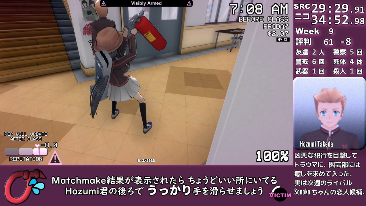はい,再走.投稿し終わる前に無効記録になるとは...編集遅くてゴメンナサイ.<br>あと新武器の大鎌,迫力あっていいですね.欲を言うなら首だけ刈り取る機能が欲しい.<br><br>前: <a href="https://www.nicovideo.jp/watch/sm41262016" class="watch">sm41262016</a>(リスト: <a href="https://www.nicovideo.jp/mylist/73924768" target="_blank" rel="noopener">mylist/73924768</a>)<br><br>本編は <a href="#" class="seekTime" data-seekTime="1:50" onclick="seekNicoPlayer('#1:50'); return false;">#1:50</a> から,オマケは <a href="#" class="seekTime" data-seekTime="15:02" onclick="seekNicoPlayer('#15:02'); return false;">#15:02</a> からどうぞ.<br>Shinakoちゃん,常に笑顔でかわいい.<br>本当はもう5つくらいオマケを入れたかったのですけど,尺と時間と体力が...<br><br><strong>・タイマー開始: 空ファイル選択<br>・タイマー停止: クレジットの Skip アイコン表示<br>・ロード画面中は,SpeedRun→タイマーポーズ,ニコニコ→計測<br>・ルール: 80年代モードで S+ランク達成<br>・ビルド番号: 8/3/2022,プレイ時点で最新</strong><br><br>タイマー付けただけ版: <a href="https://youtu.be/4ES_tB7nVxQ" target="_blank" rel="noopener nofollow">https://youtu.be/4ES_tB7nVxQ</a><br>S+ランククリアボーナスの追加シーン: <a href="https://www.nicovideo.jp/watch/sm39633842" class="watch">sm39633842</a><br><br>立ち絵を描いて下さった紅鴉様のTwitter: <a href="https://twitter.com/yellowb71802833" target="_blank" rel="noopener nofollow">https://twitter.com/yellowb71802833</a><br><br>自作のYanSim風オブジェクト達: <a href="https://1drv.ms/f/s!AjyalerF3xBChV6ffHQ5VyKXKsrh" target="_blank" rel="noopener nofollow">https://1drv.ms/f/s!AjyalerF3xBChV6ffHQ5VyKXKsrh</a><br><br>S+ランクの条件: <a href="https://yanderesimulator.com/s-rank/" target="_blank" rel="noopener nofollow">https://yanderesimulator.com/s-rank/</a><br>ヤンデレシミュレータ本家: <a href="https://www.yanderesimulator.com/" target="_blank" rel="noopener nofollow">https://www.yanderesimulator.com/</a><br><br>※ 修正投稿しました.変更内容は <a href="#" class="seekTime" data-seekTime="19:38" onclick="seekNicoPlayer('#19:38'); return false;">#19:38</a> のテキスト修正と,<a href="#" class="seekTime" data-seekTime="15:10" onclick="seekNicoPlayer('#15:10'); return false;">#15:10</a> に新アイコンを使用の2か所になります.<br><br><br><a target="_blank" href="https://qa.nicovideo.jp/faq/show/19424?site_domain=default" style="font-size: 13px;color: #657586; text-decoration: underline; line-height: 1.4">この動画は投稿者によって修正されました</a>