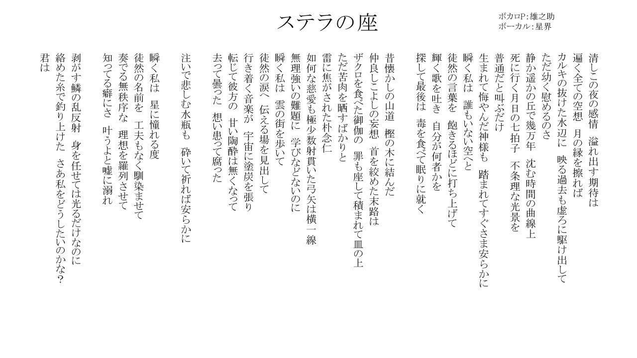 本家様:<a href="https://www.nicovideo.jp/watch/sm40319025" class="watch">sm40319025</a><br><br>無名歌唱祭マイリスト<br>1~50:<a href="https://www.nicovideo.jp/mylist/74041748" target="_blank" rel="noopener">mylist/74041748</a><br>51~100:<a href="https://www.nicovideo.jp/mylist/74106525" target="_blank" rel="noopener">mylist/74106525</a><br>101~150:<a href="https://www.nicovideo.jp/mylist/74106527" target="_blank" rel="noopener">mylist/74106527</a><br>151~227:<a href="https://www.nicovideo.jp/mylist/74106529" target="_blank" rel="noopener">mylist/74106529</a><br><br>答え<br>1~50:<a href="https://www.nicovideo.jp/watch/sm41506807" class="watch">sm41506807</a><br>51~100:<a href="https://www.nicovideo.jp/watch/sm41506808" class="watch">sm41506808</a><br>101~150:<a href="https://www.nicovideo.jp/watch/sm41513939" class="watch">sm41513939</a><br>151~200:<a href="https://www.nicovideo.jp/watch/sm41513940" class="watch">sm41513940</a><br>201~227:<a href="https://www.nicovideo.jp/watch/sm41513942" class="watch">sm41513942</a><br><br>リスト:<a href="https://docs.google.com/spreadsheets/d/1uIPLFTmjTluZKnQ9075kux-oC-BpXtERQmi0dcUWCQI/edit?usp=sharing" target="_blank" rel="noopener nofollow">https://docs.google.com/spreadsheets/d/1uIPLFTmjTluZKnQ9075kux-oC-BpXtERQmi0dcUWCQI/edit?usp=sharing</a><br>