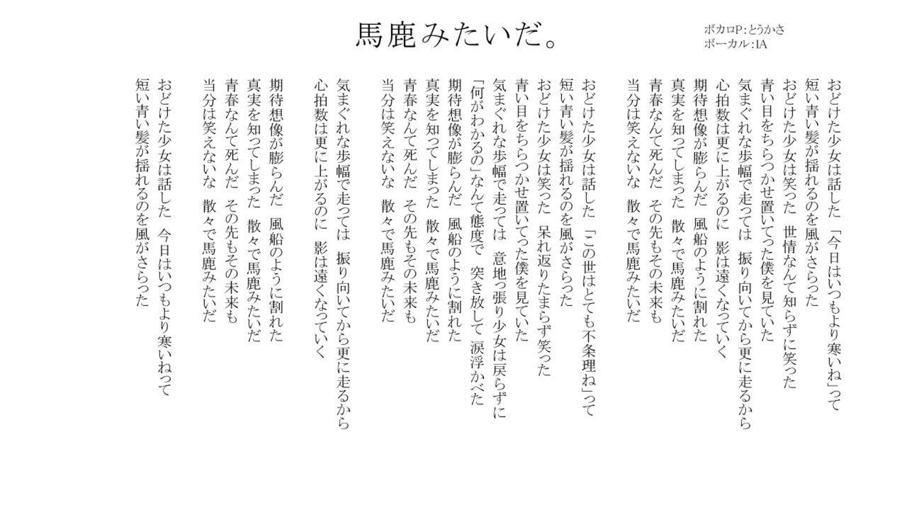 本家様:<a href="https://www.nicovideo.jp/watch/sm33323920" class="watch">sm33323920</a><br><br>無名歌唱祭マイリスト<br>1~50:<a href="https://www.nicovideo.jp/mylist/74041748" target="_blank" rel="noopener">mylist/74041748</a><br>51~100:<a href="https://www.nicovideo.jp/mylist/74106525" target="_blank" rel="noopener">mylist/74106525</a><br>101~150:<a href="https://www.nicovideo.jp/mylist/74106527" target="_blank" rel="noopener">mylist/74106527</a><br>151~227:<a href="https://www.nicovideo.jp/mylist/74106529" target="_blank" rel="noopener">mylist/74106529</a><br><br>答え<br>1~50:<a href="https://www.nicovideo.jp/watch/sm41506807" class="watch">sm41506807</a><br>51~100:<a href="https://www.nicovideo.jp/watch/sm41506808" class="watch">sm41506808</a><br>101~150:<a href="https://www.nicovideo.jp/watch/sm41513939" class="watch">sm41513939</a><br>151~200:<a href="https://www.nicovideo.jp/watch/sm41513940" class="watch">sm41513940</a><br>201~227:<a href="https://www.nicovideo.jp/watch/sm41513942" class="watch">sm41513942</a><br><br>リスト:<a href="https://docs.google.com/spreadsheets/d/1uIPLFTmjTluZKnQ9075kux-oC-BpXtERQmi0dcUWCQI/edit?usp=sharing" target="_blank" rel="noopener nofollow">https://docs.google.com/spreadsheets/d/1uIPLFTmjTluZKnQ9075kux-oC-BpXtERQmi0dcUWCQI/edit?usp=sharing</a><br>