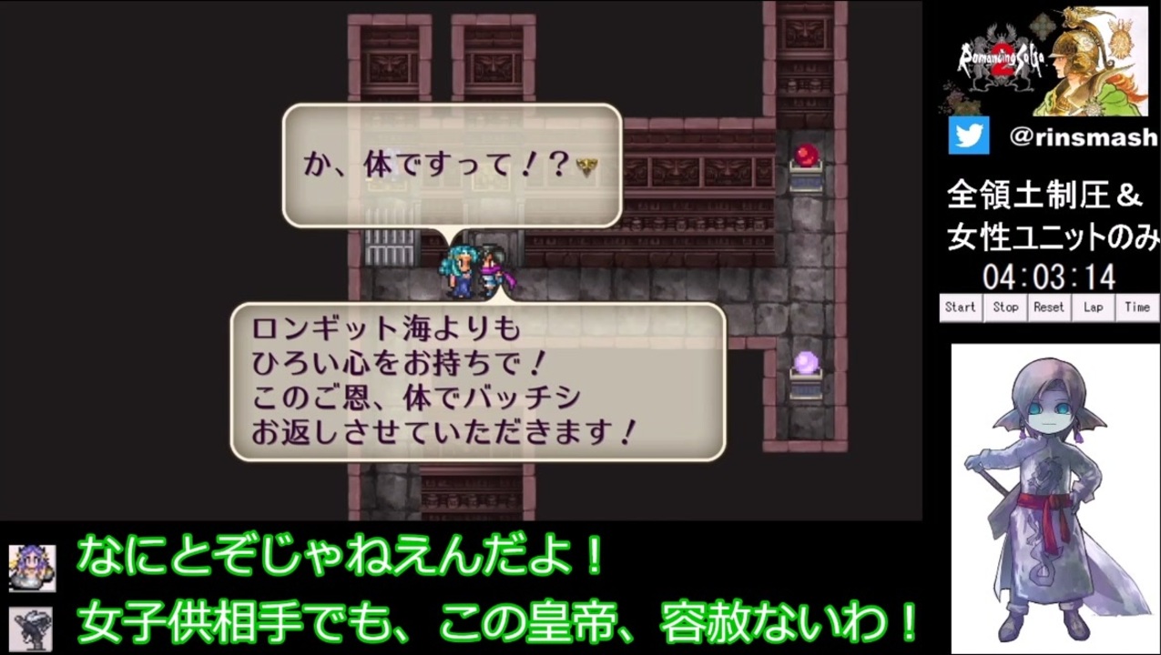 <a href="https://www.nicovideo.jp/watch/sm41439285" class="watch">sm41439285</a>←前 <a href="https://www.nicovideo.jp/mylist/74081215" target="_blank" rel="noopener">mylist/74081215</a> 次→<a href="https://www.nicovideo.jp/watch/sm41545518" class="watch">sm41545518</a><br><a href="https://www.nicovideo.jp/series/371668" target="_blank" rel="noopener nofollow">https://www.nicovideo.jp/series/371668</a><br><br>・使用するのはレオン代除いて女性ユニットのみ<br>・クリアするまでに全領土を制圧する(ダンジョン除外)<br><br>録画元は自分のニコニコ生放送です<br><br>プレイ環境<br>Switch版ロマサガ2HDリメイク<br><br>他の投稿動画シリーズ(一部)<br>【完全ノータンク縛り】メトロイドプライムハードモード <a href="https://www.nicovideo.jp/user/652845/series/500012" target="_blank" rel="noopener nofollow">https://www.nicovideo.jp/user/652845/series/500012</a><br>FF5縛りありRTA(ゆっくり実況) <a href="https://www.nicovideo.jp/series/322107" target="_blank" rel="noopener nofollow">https://www.nicovideo.jp/series/322107</a><br>迫真ガバガバ将棋部 <a href="https://www.nicovideo.jp/series/231191" target="_blank" rel="noopener nofollow">https://www.nicovideo.jp/series/231191</a><br>メトロイドドレッドRTA <a href="https://www.nicovideo.jp/series/288461" target="_blank" rel="noopener nofollow">https://www.nicovideo.jp/series/288461</a><br>STGとか <a href="https://www.nicovideo.jp/series/232145" target="_blank" rel="noopener nofollow">https://www.nicovideo.jp/series/232145</a><br><br>YouTube版<br><a href="https://youtu.be/VNfJBa1XVwQ" target="_blank" rel="noopener nofollow">https://youtu.be/VNfJBa1XVwQ</a><br><br>唯桜兄貴、苦沙弥兄貴、シン兄貴、koban兄貴、みけ猫兄貴、時の君兄貴、mkolp兄貴、POM兄貴、ハースガルド兄貴、tonton兄貴、chem兄貴、ng51兄貴、White_Cat兄貴、こわし兄貴、にやとー兄貴、きくたん兄貴、量産型運河兄貴、ソードマスター兄貴、GGG兄貴、どうも兄貴、<a href="https://www.nicovideo.jp/watch/sm13869948" class="watch">sm13869948</a>兄貴、Noir兄貴、春巻兄貴、tatibana兄貴、JAPANweb兄貴、oganinja兄貴、RE-90/EROベイダー兄貴、大谷屋兄貴、shigie兄貴、punipuni兄貴、おちこち兄貴、くらば兄貴、マイアミの太陽より熱い男兄貴、広告ありがとナス!